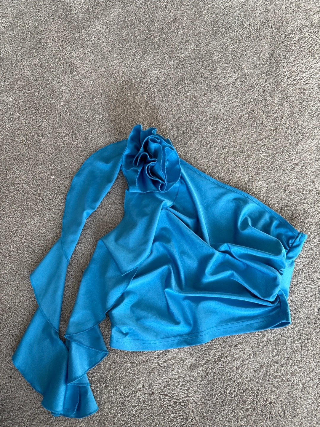 Selling a cute blue one-shoulder top from Shein! It's a size small and made of 87% polyester and 13% elastane