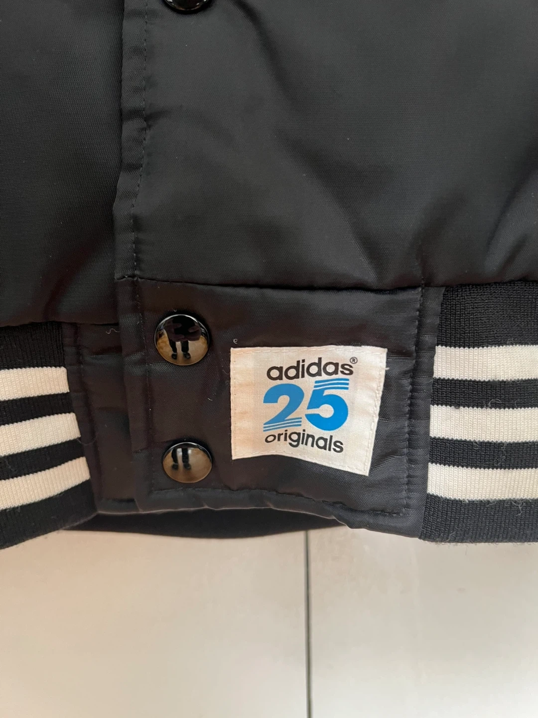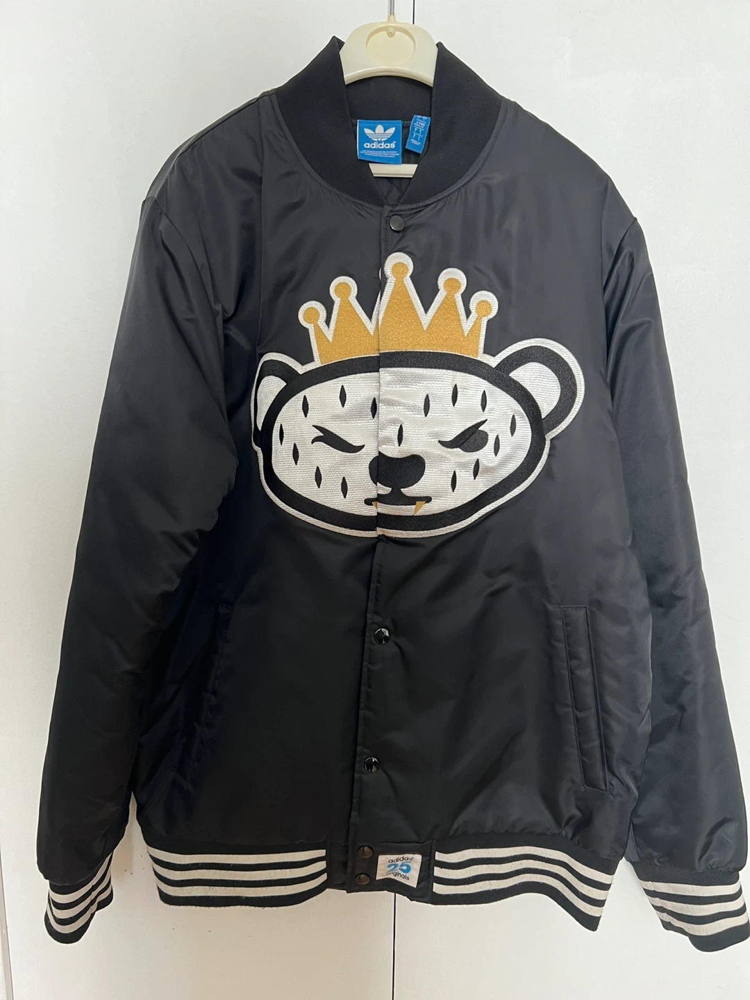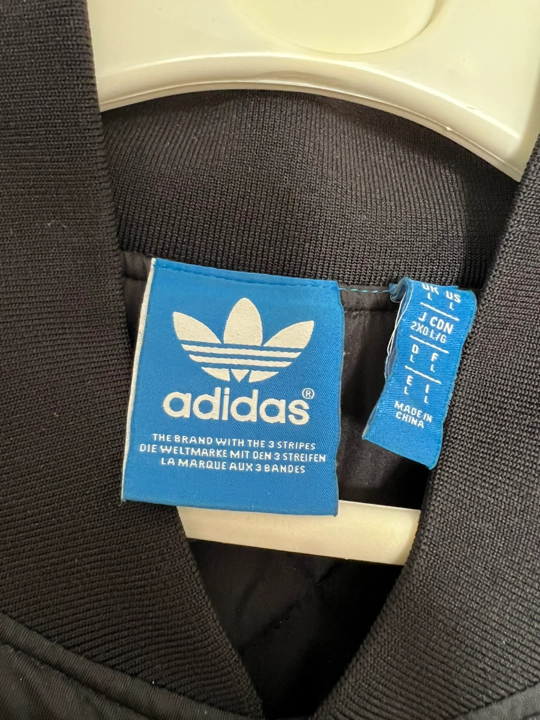 21Adidas Originals bomber jacket in black. Features a cool design on the front! Size L. Great for adding some street style to your wardrobe