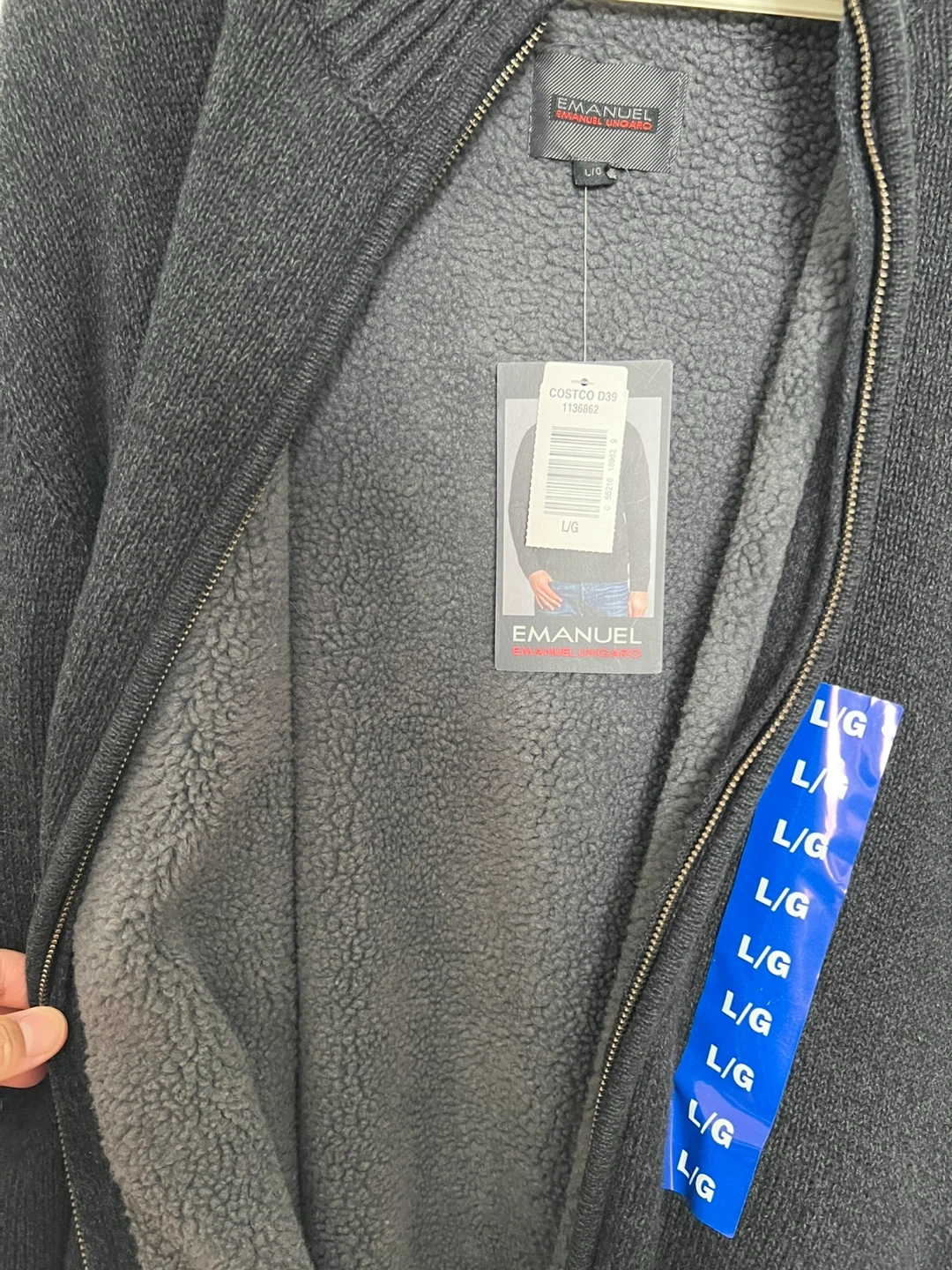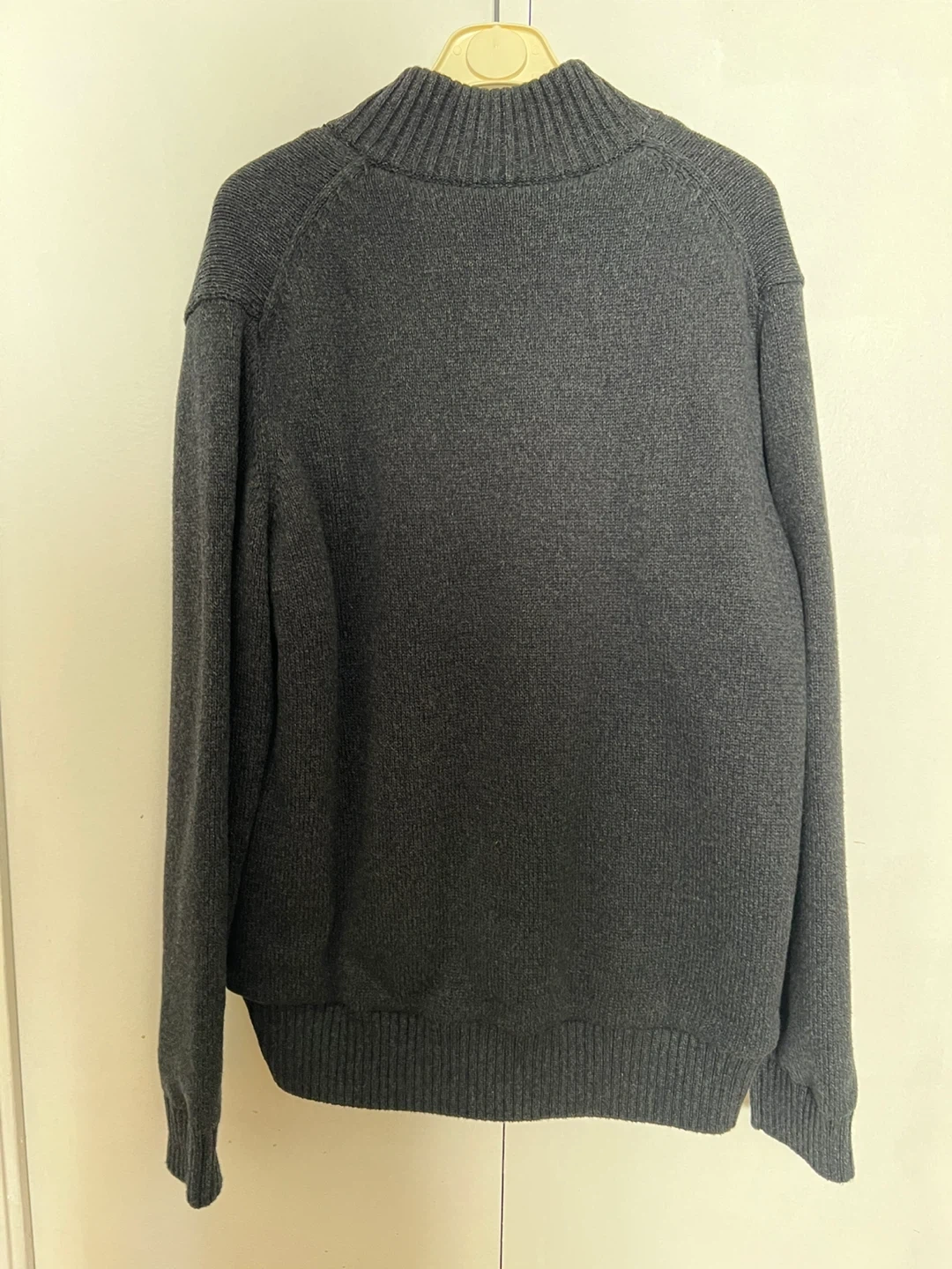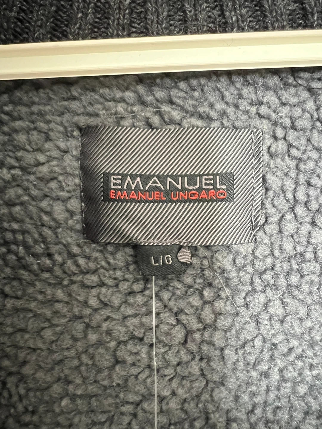 21Here's a cozy Emanuel Ungaro cardigan in a dark gray colour! It's a size large and features a full zip. Perfect for layering on those cooler days