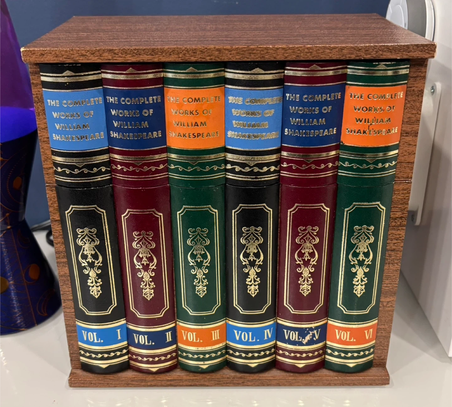 138Here's a unique decanter set that looks like a set of Shakespeare books! It comes with a glass decanter, shot glasses, and a wooden box designed to look like classic books. It's a great conversation starter for your home bar or a fun gift for a book lover