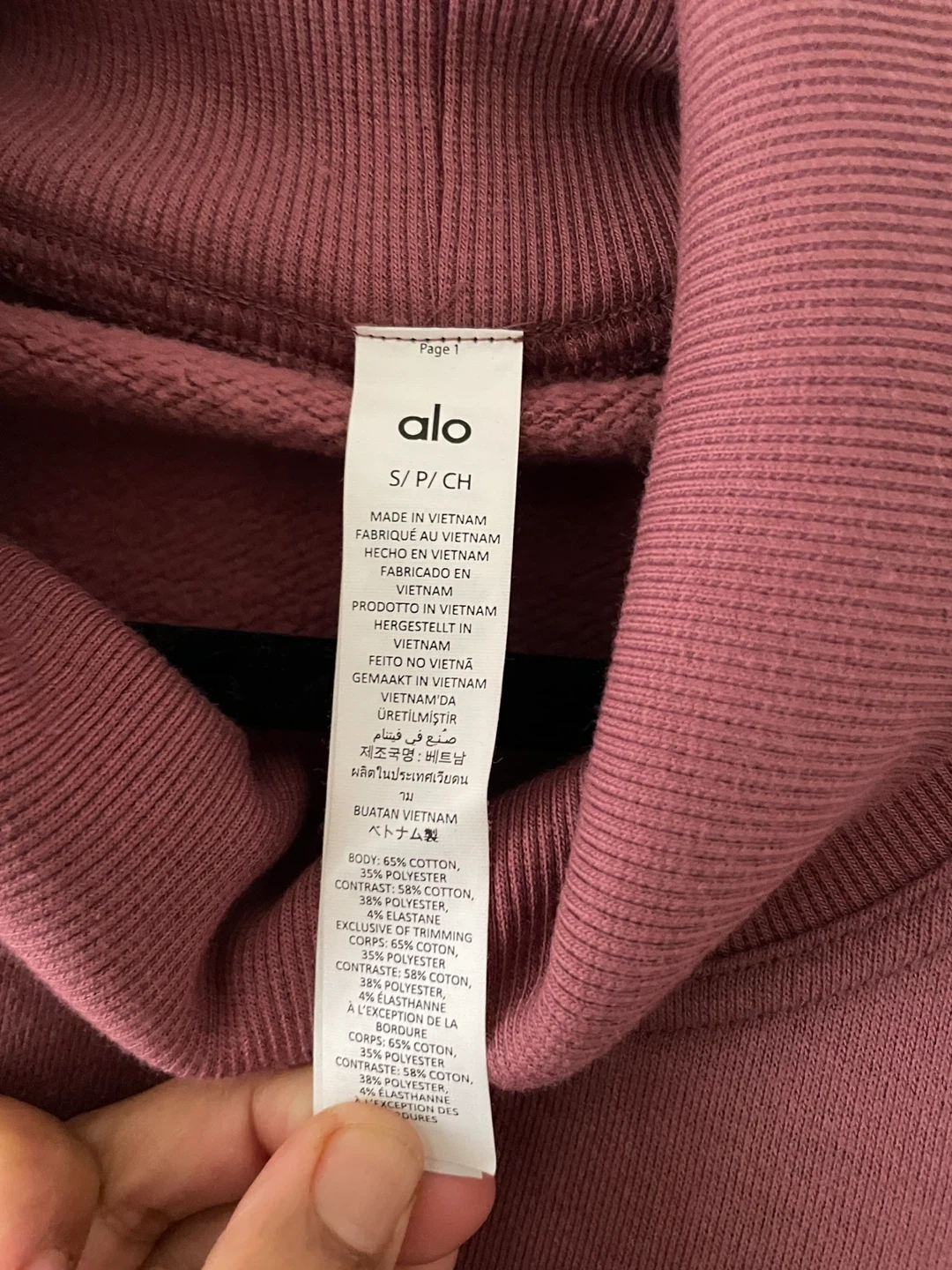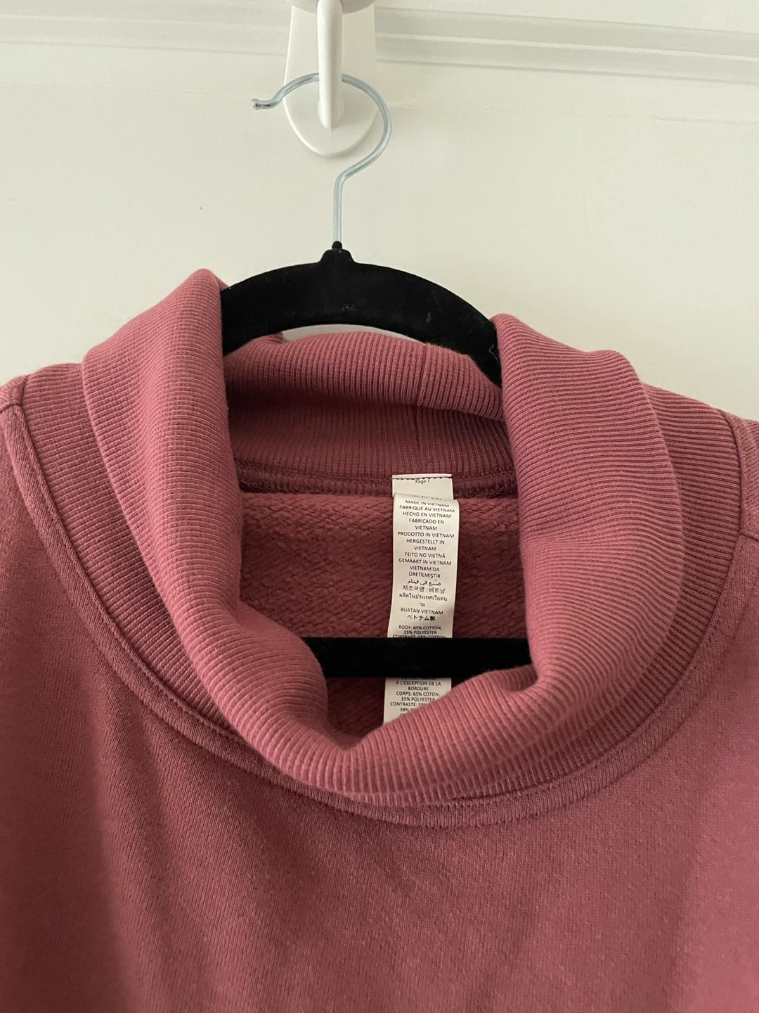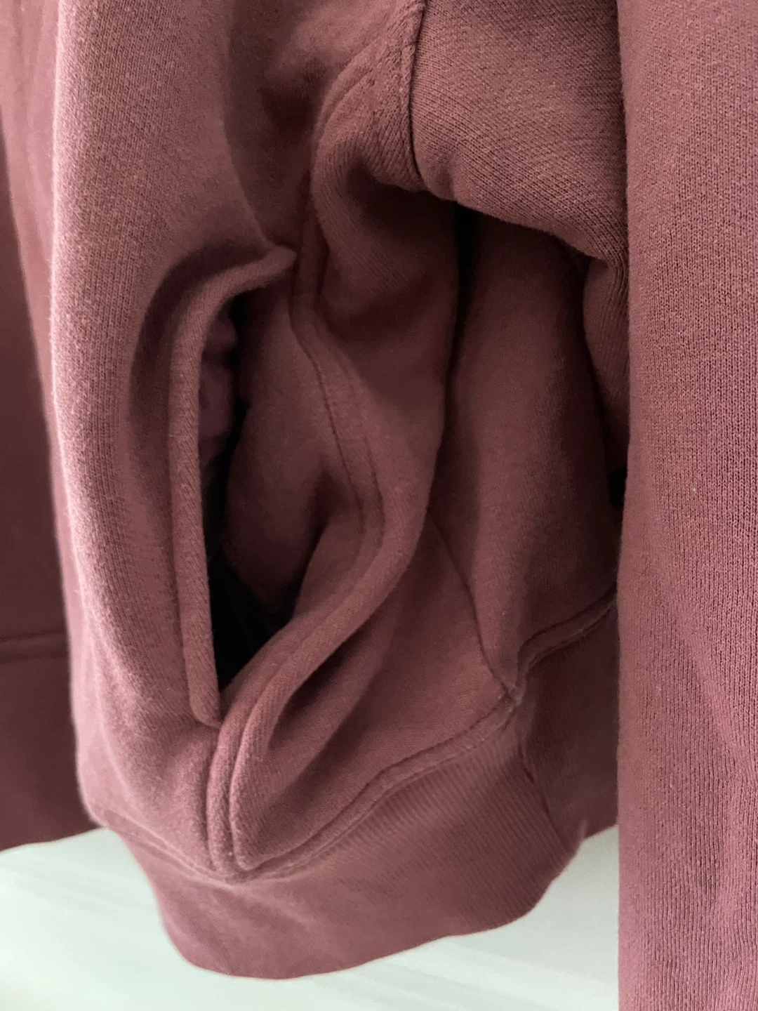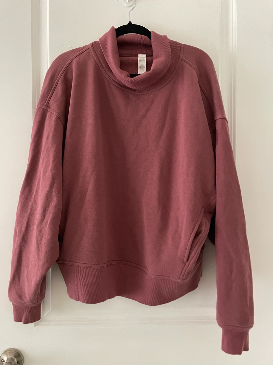 It's in great condition and super comfy! The colour is a beautiful mauve/burgundy. Made of 65% cotton and 35% polyester.