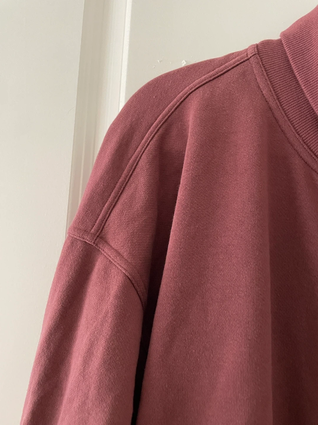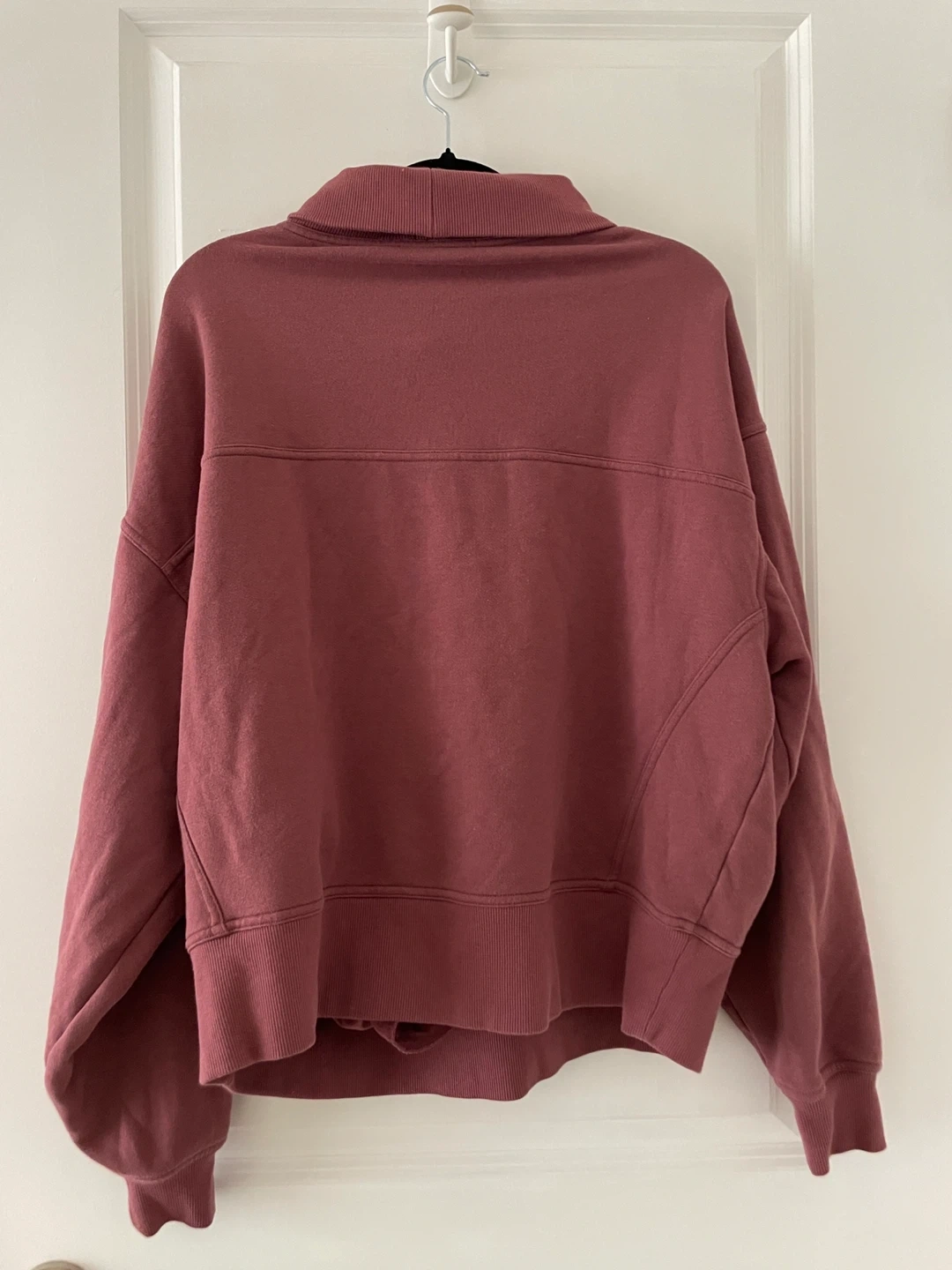 It's in great condition and super comfy! The colour is a beautiful mauve/burgundy. Made of 65% cotton and 35% polyester.