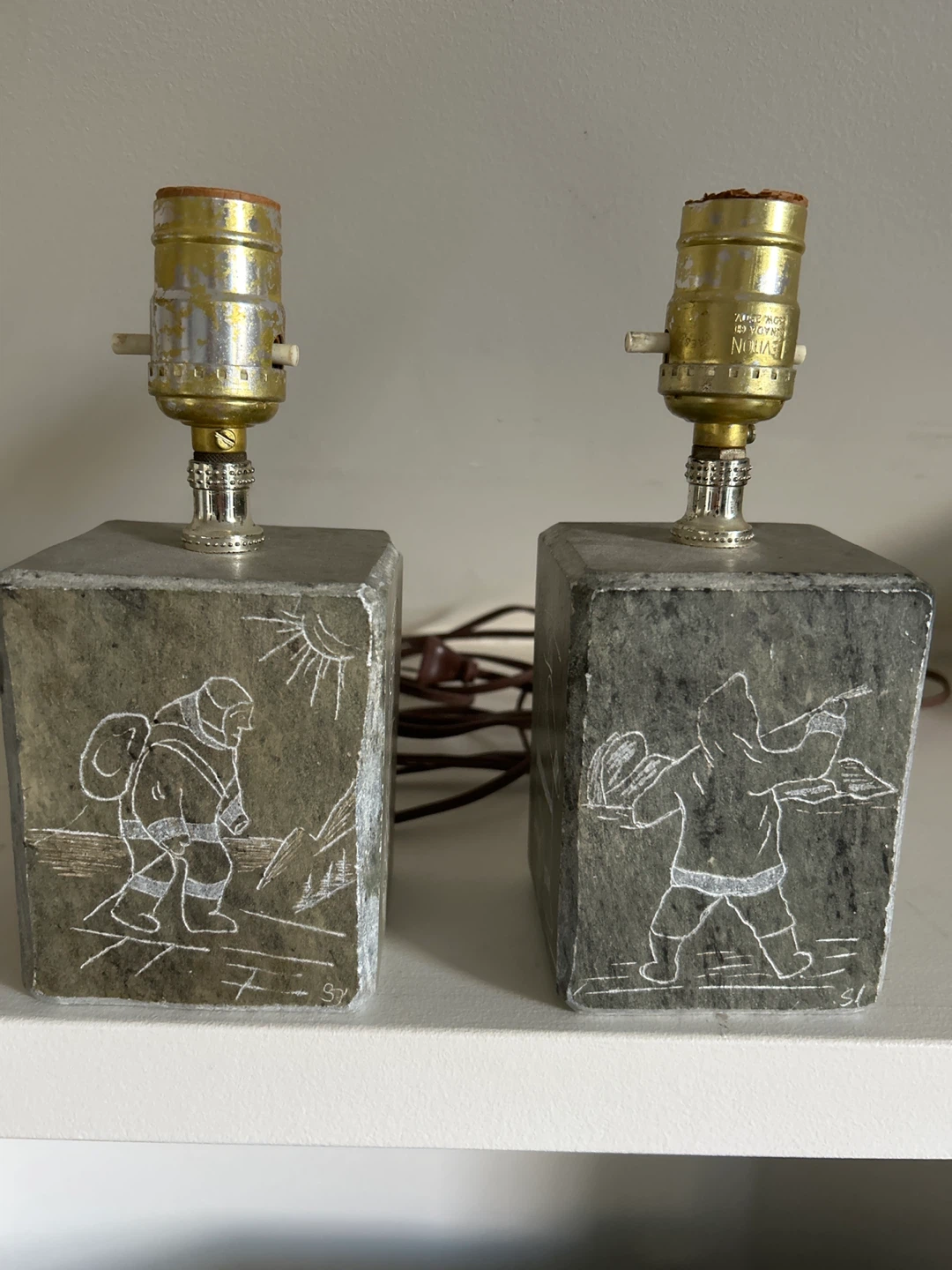 Selling a pair of unique vintage table lamps. They feature soapstone bases with Inuit-themed carvings and an owl design. 5”H X 3.5” W