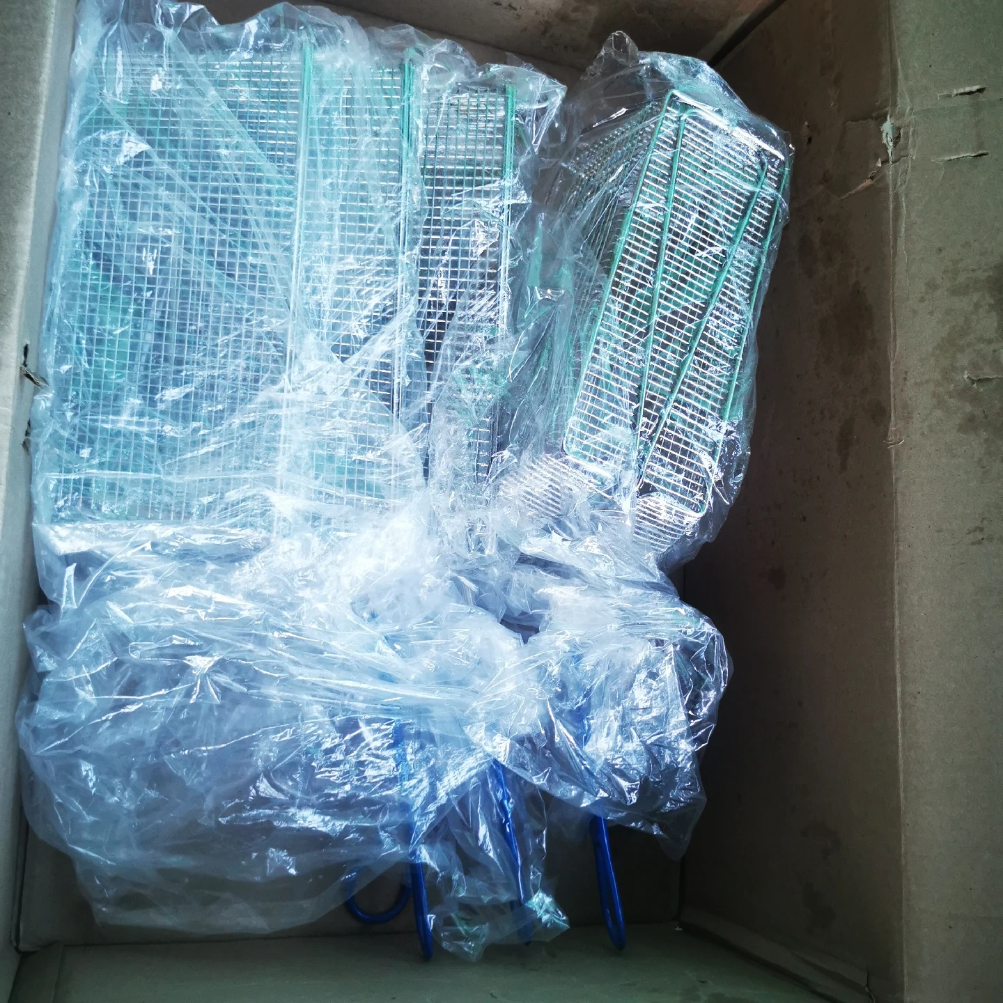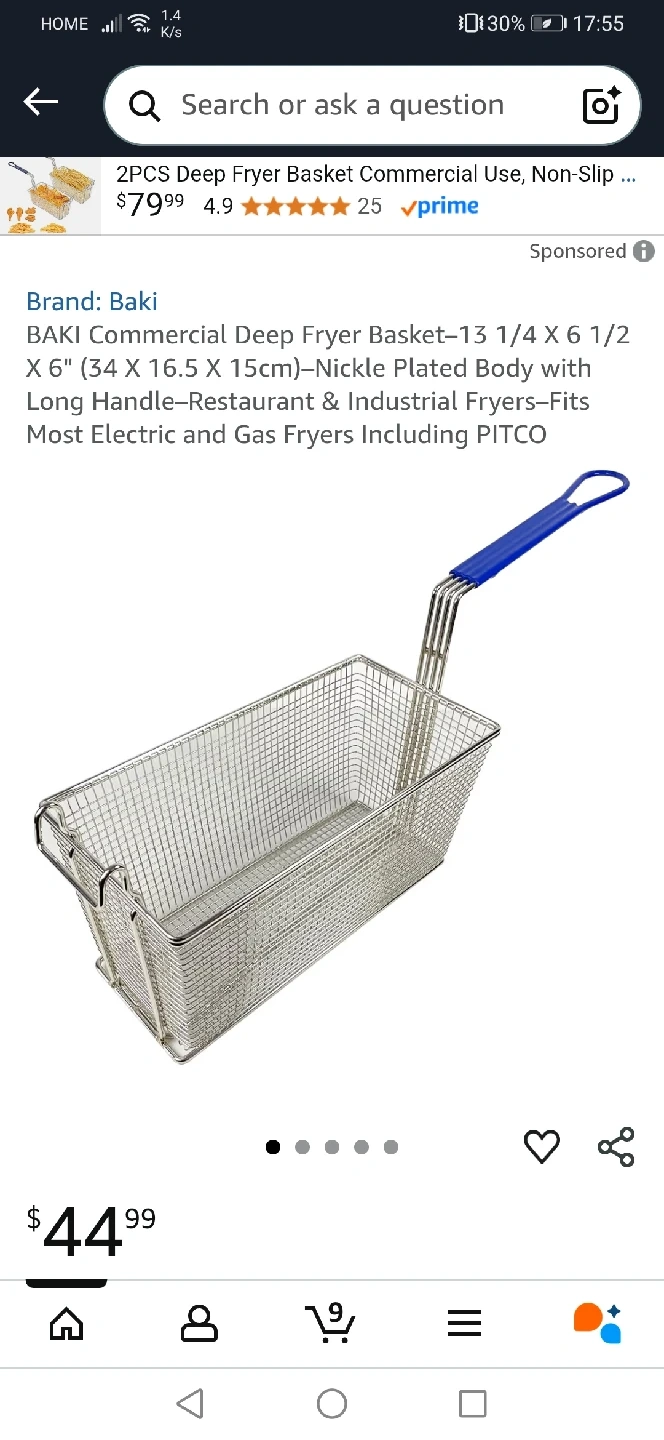 616Selling a Baki deep fryer baskets. It's a commercial grade basket with a non-slip handle. The basket measures 13 1/4 x 6 1/2 x 6 inches (34 x 16.5 x 15cm) and has a nickel-plated body. It fits most electric and gas fryers, including PITCO 1 for 30 2 for 55