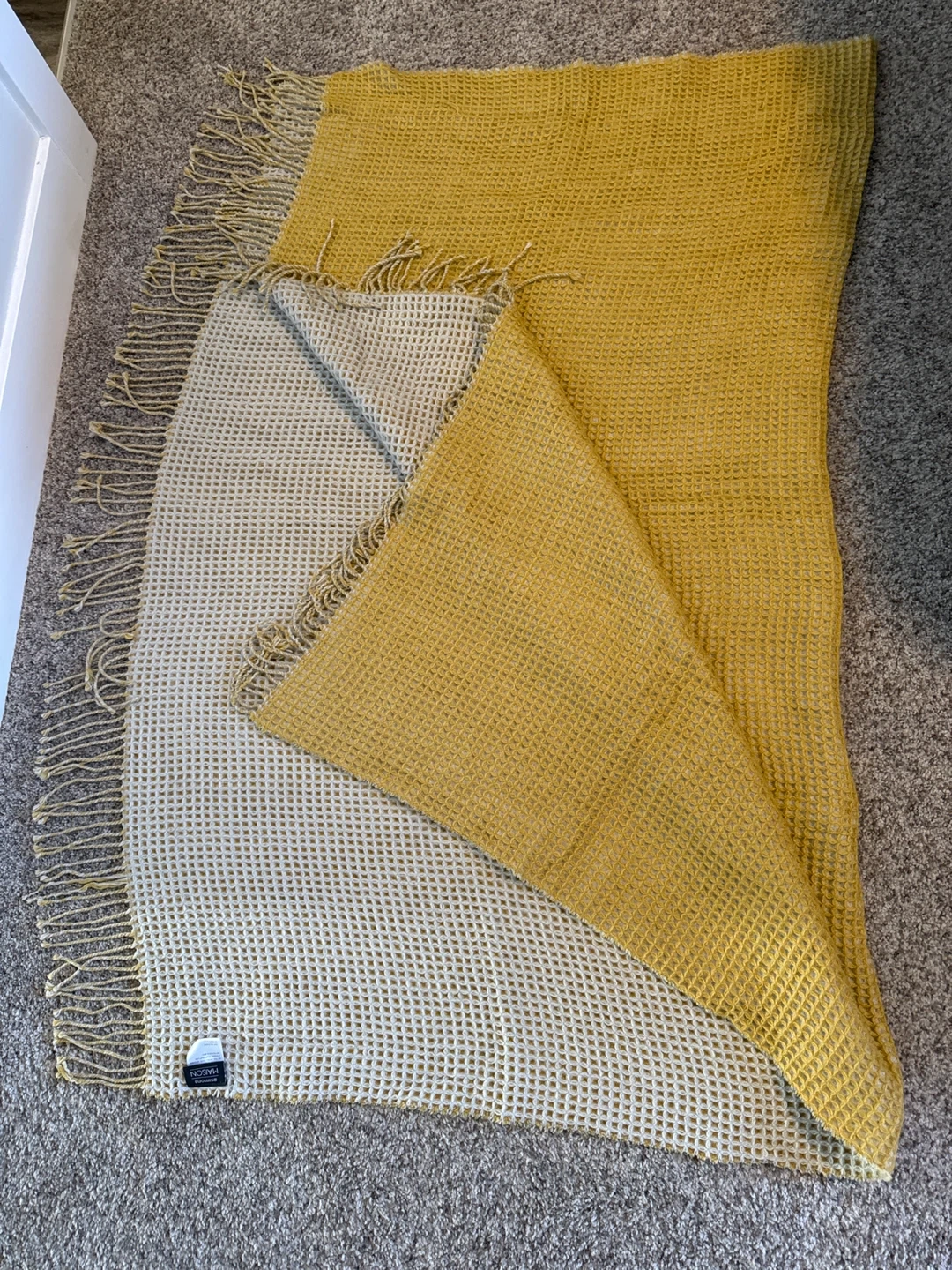 15Selling a cozy interchangeable waffle throw blanket. It's a lovely mustard yellow or white with yellow undertone colour with fringed edges. Perfect for adding a touch of warmth to your living space!