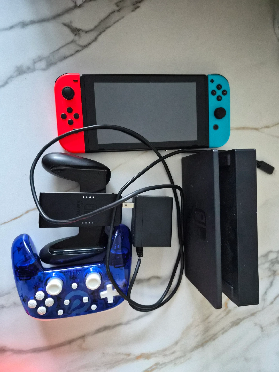 [dock, joycon holder, charger] but I've included a third party controller that works on switch, pc, and other consoles.