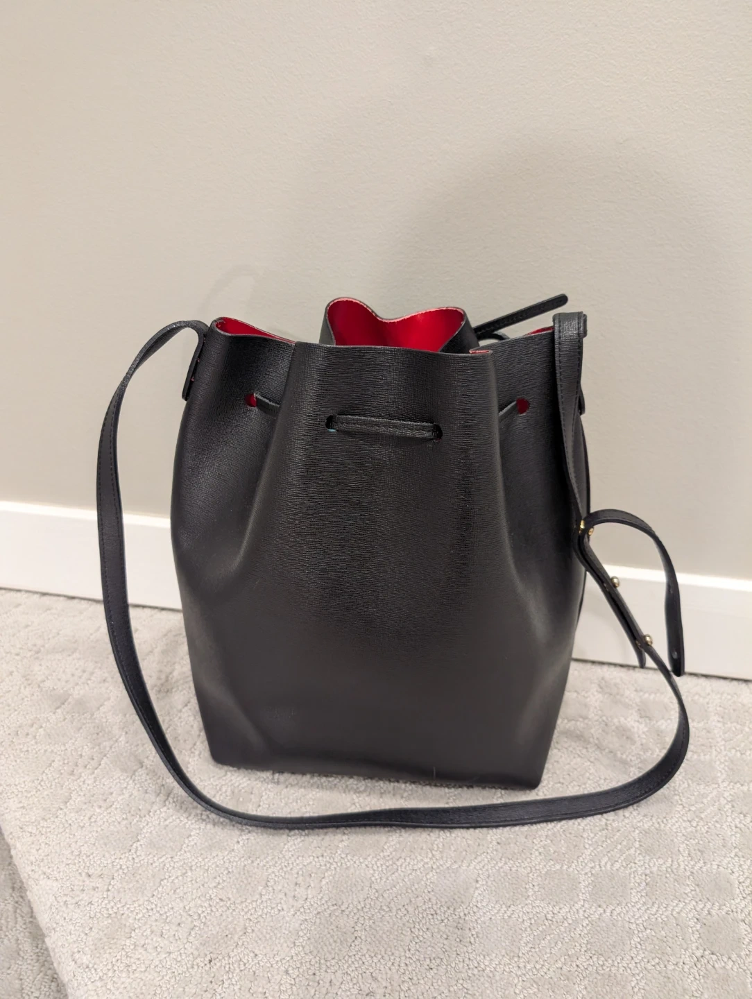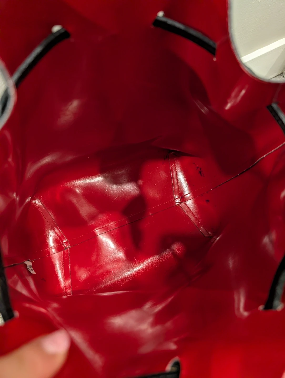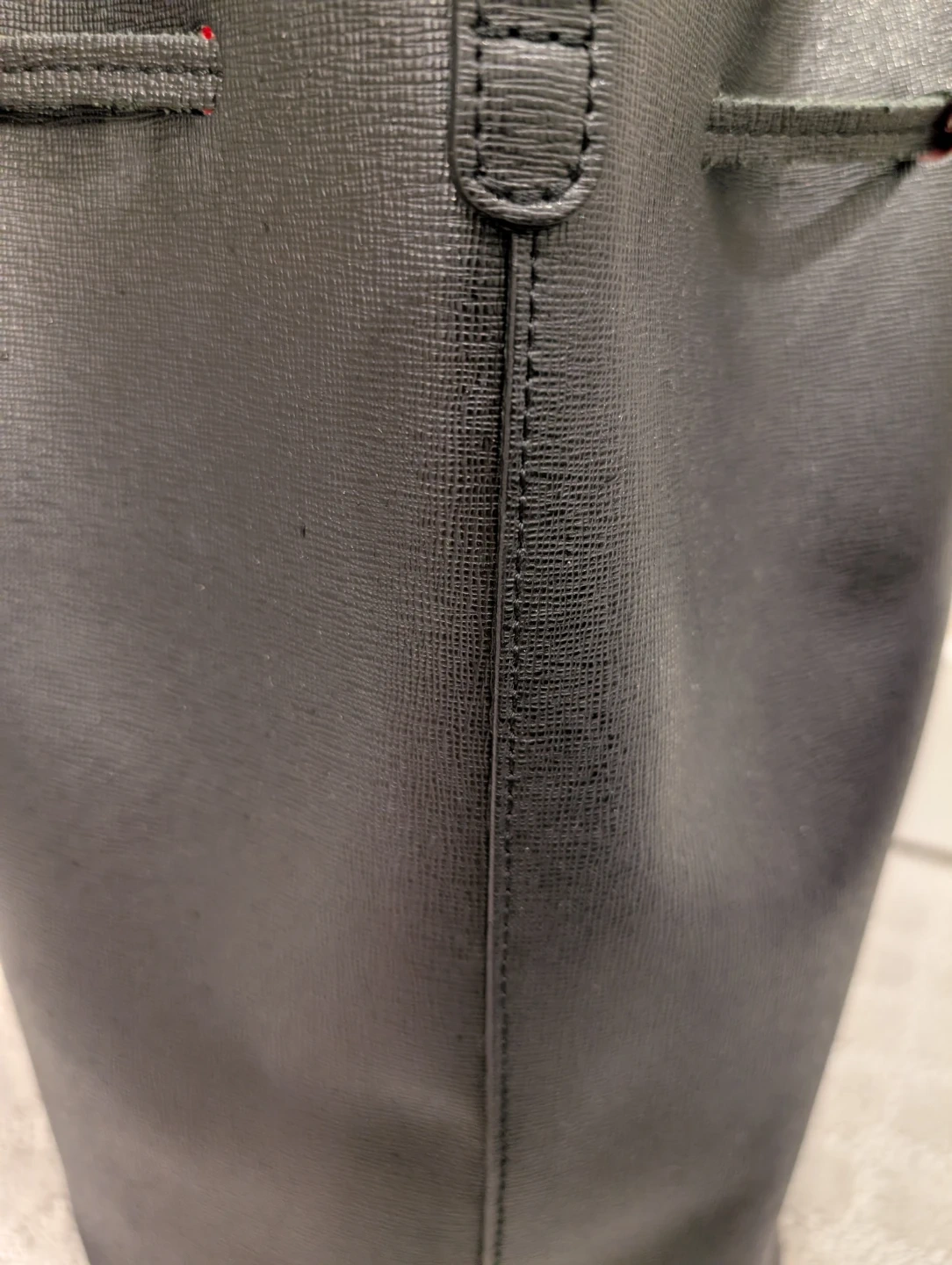 Fits a lot of things. Please see photos. Some pen stains inside and peeling a bit at top of bag near the edge. None of these things affect the function. This bag is an iconic piece that goes with everything.