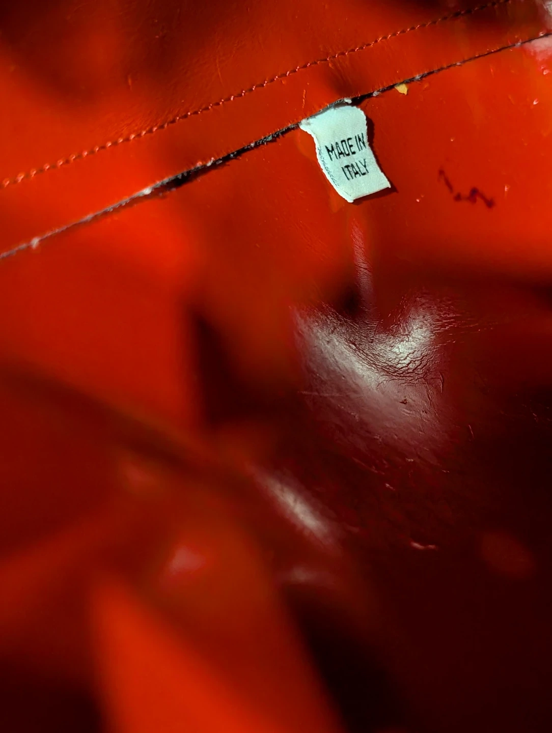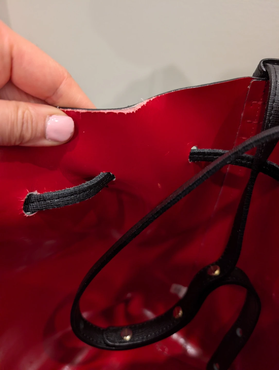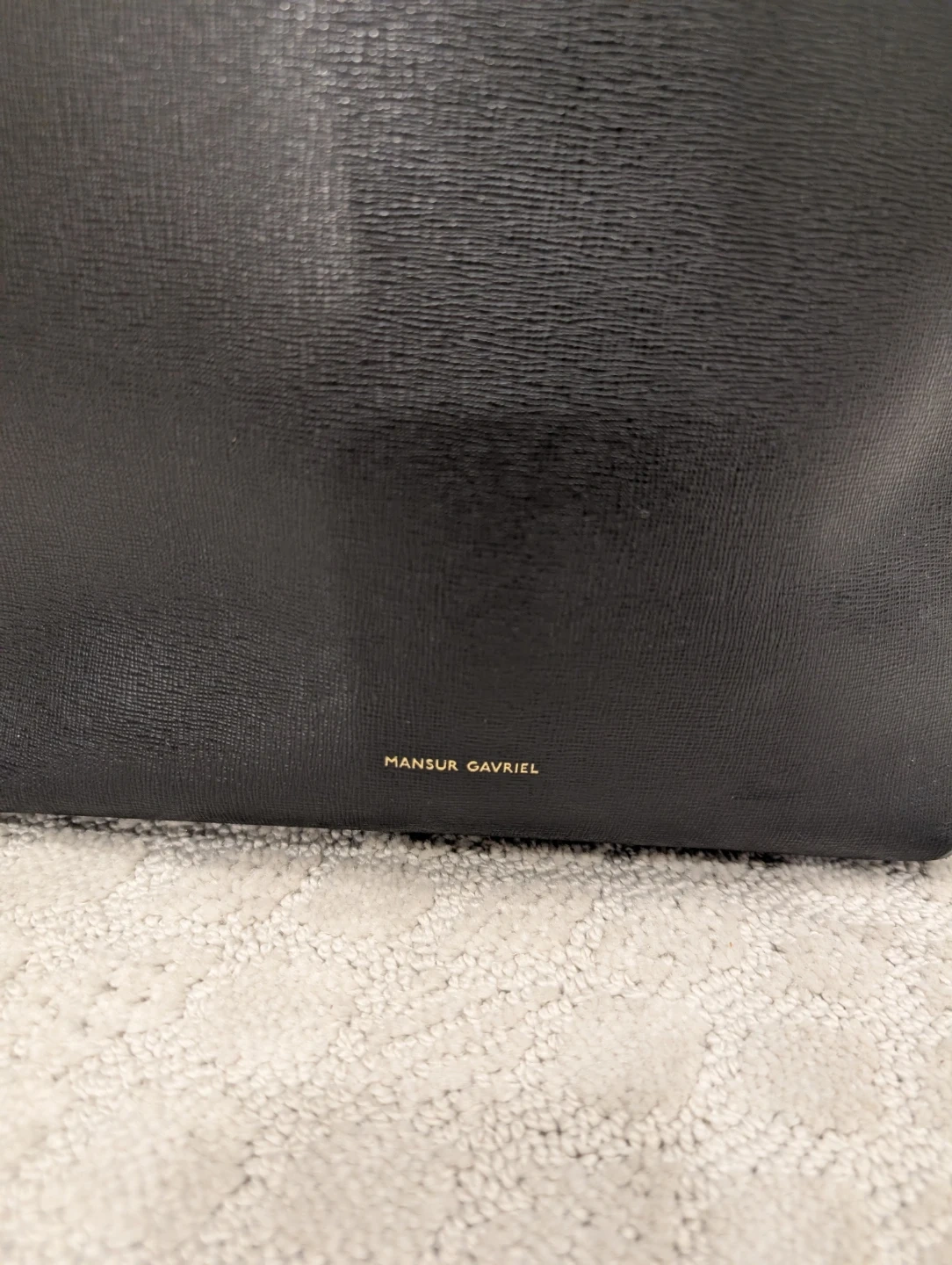 Fits a lot of things. Please see photos. Some pen stains inside and peeling a bit at top of bag near the edge. None of these things affect the function. This bag is an iconic piece that goes with everything.