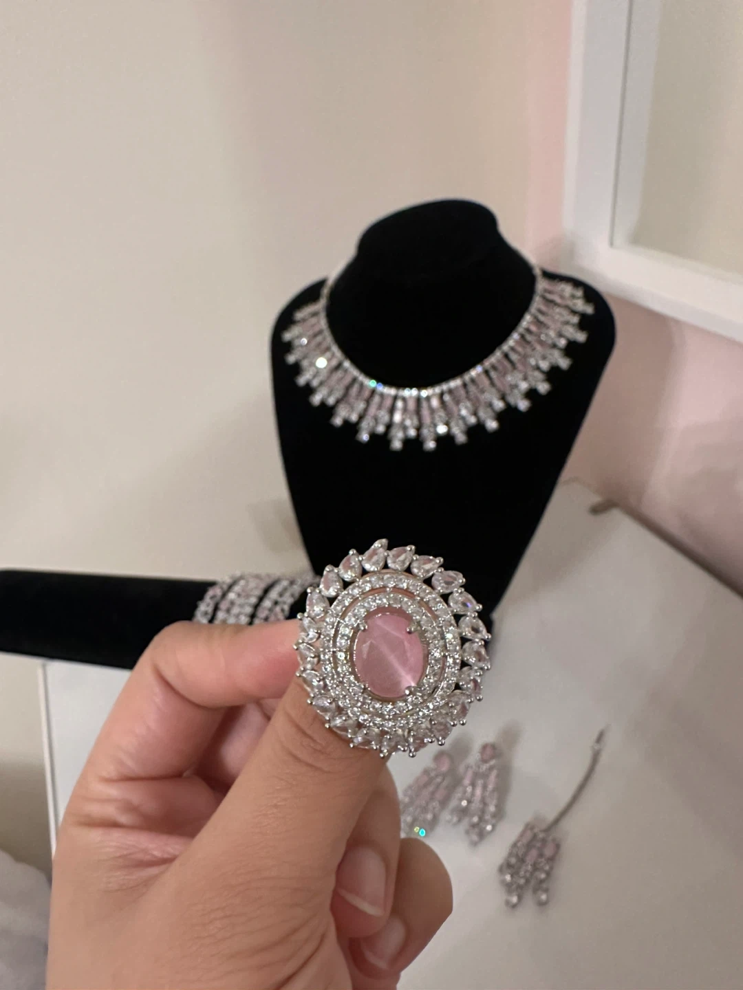Selling a beautiful jewellery set in light pink and silver tones. This set includes a necklace, earrings, a ring, bangles, and a maang tikka (headpiece). Perfect for adding a touch of elegance to any outfit!