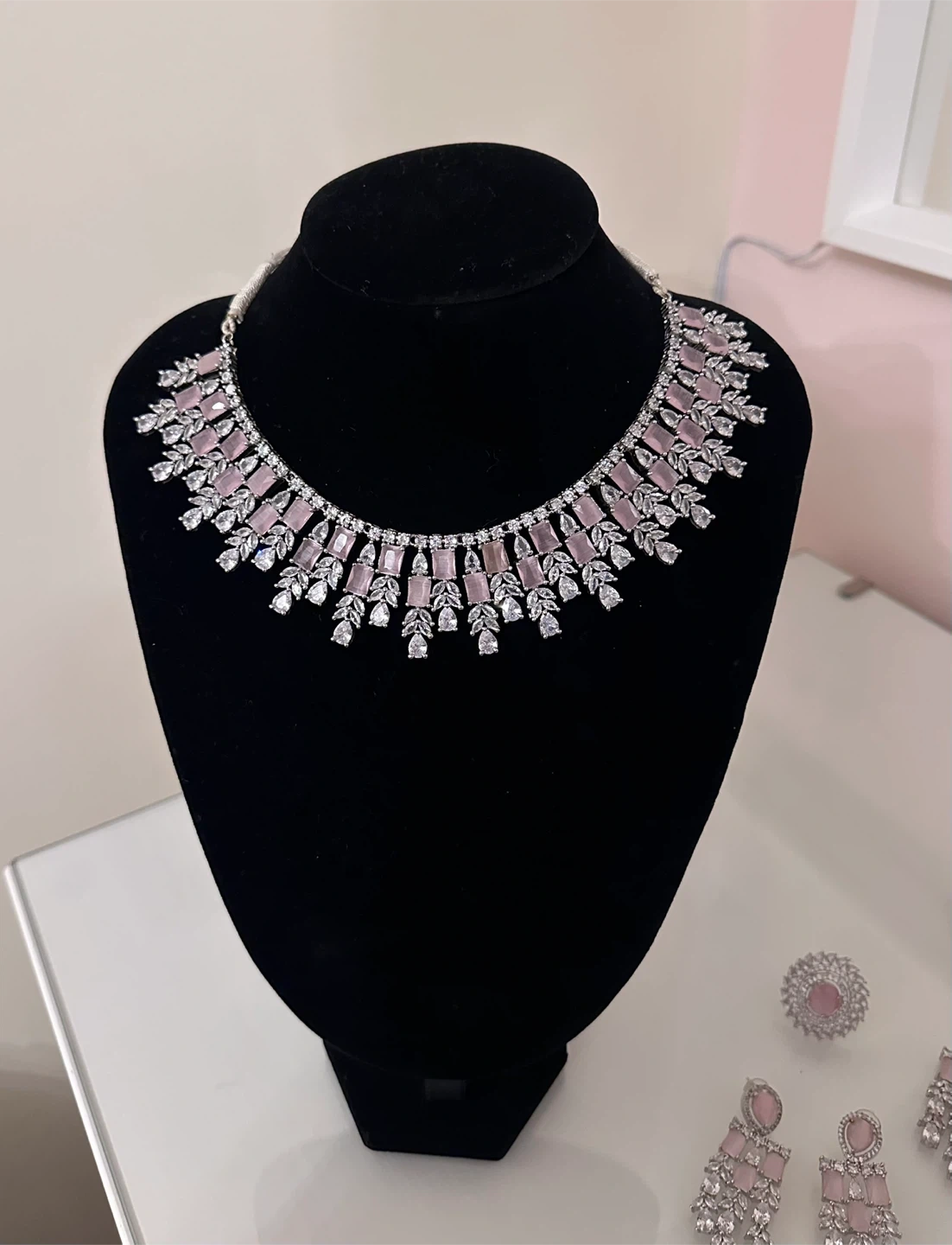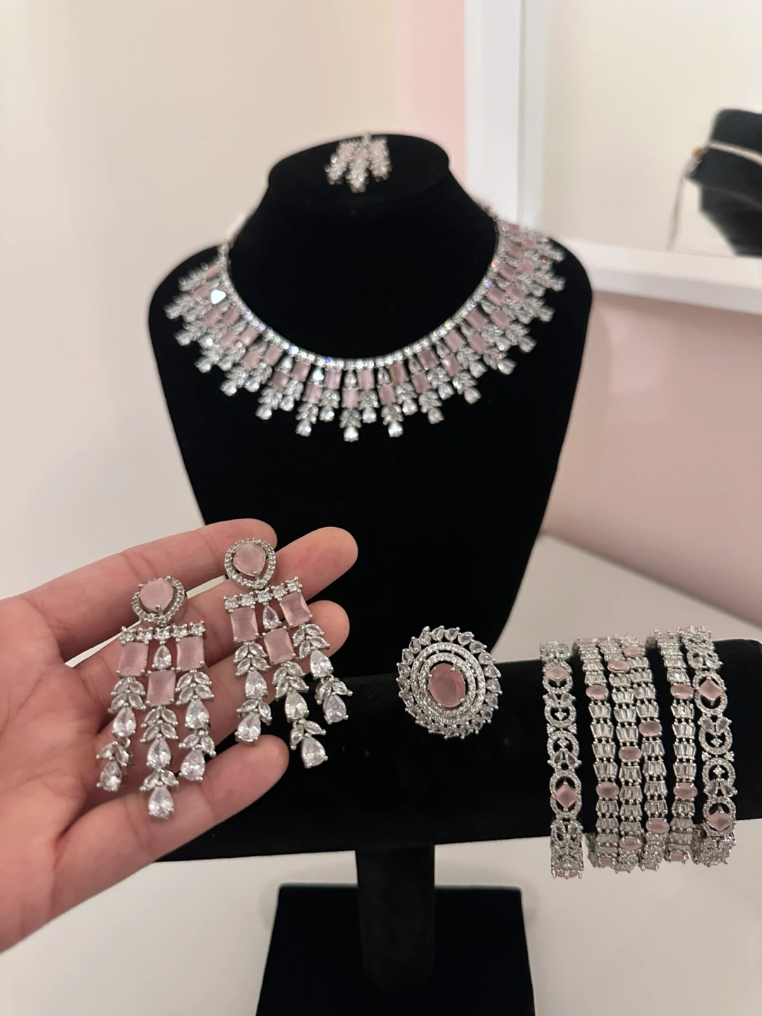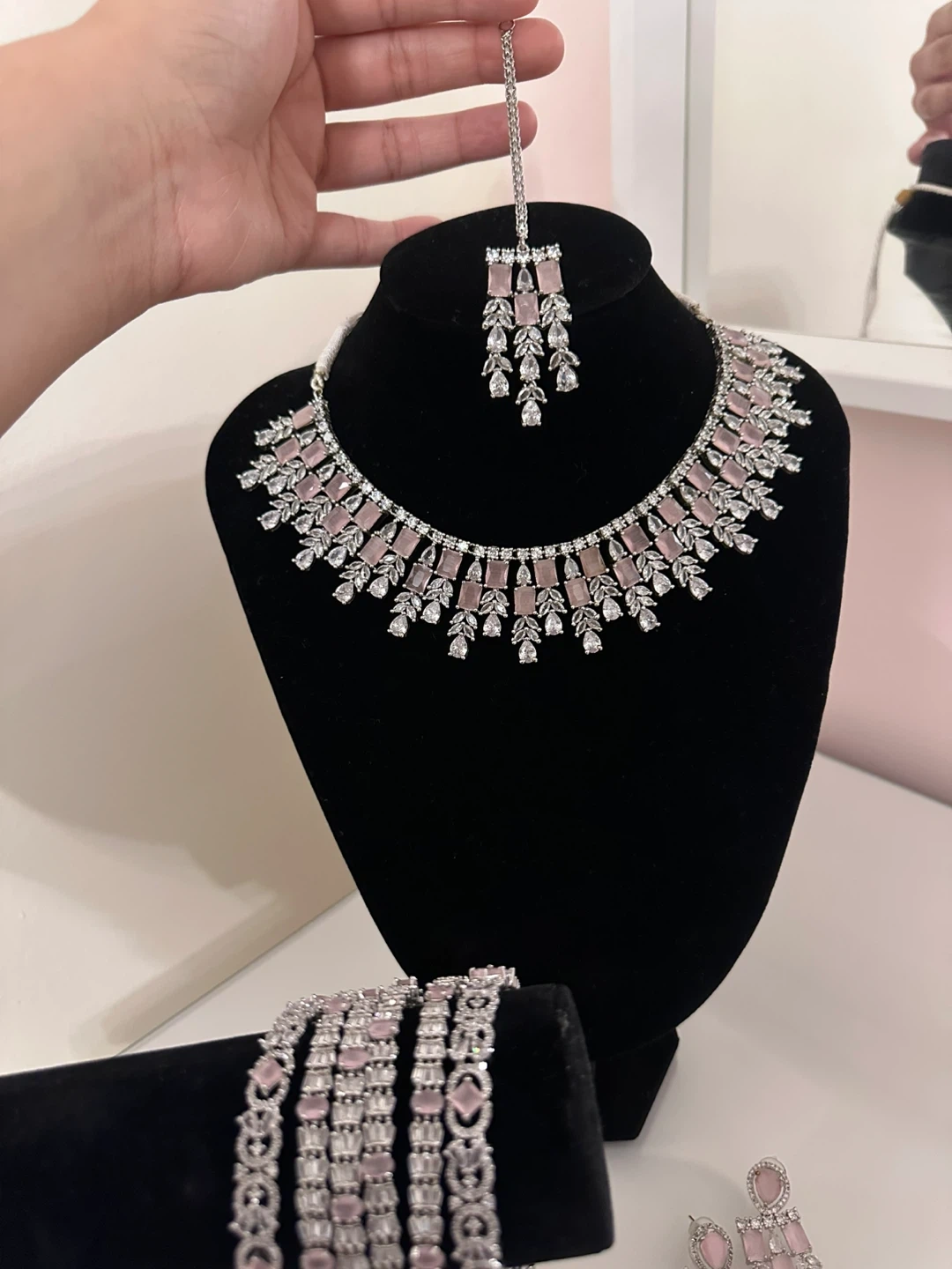 Selling a beautiful jewellery set in light pink and silver tones. This set includes a necklace, earrings, a ring, bangles, and a maang tikka (headpiece). Perfect for adding a touch of elegance to any outfit!