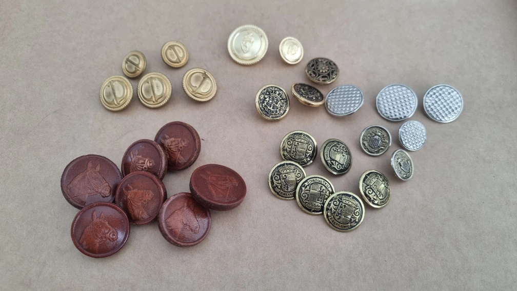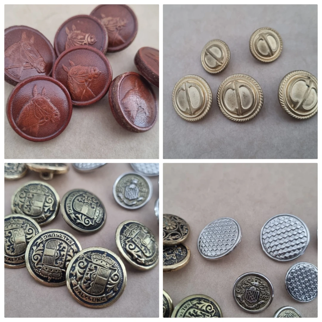 Selling a collection of assorted vintage decorative buttons. There are different styles and designs, including some with leather details and horse motifs, and others with heraldic emblems. Great for crafting or adding a unique touch to your clothing!