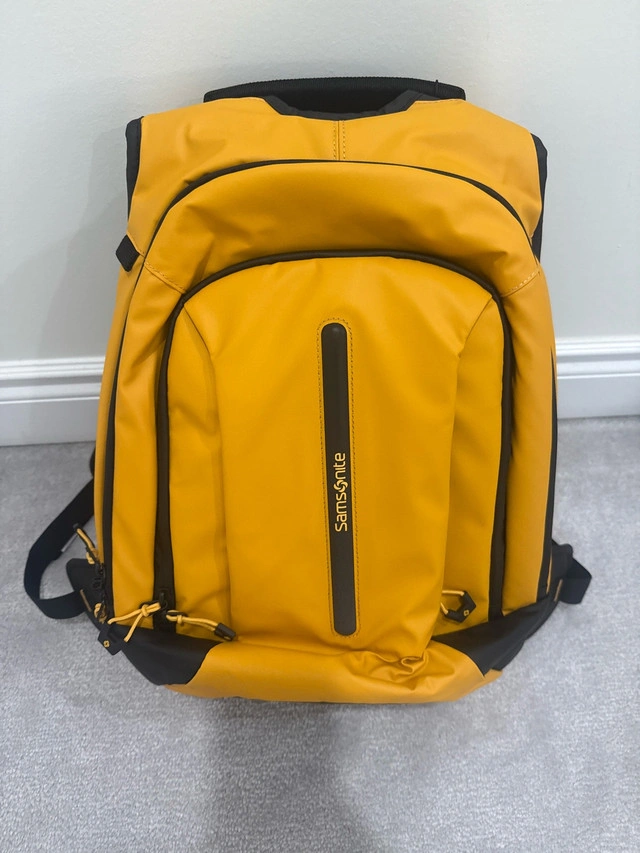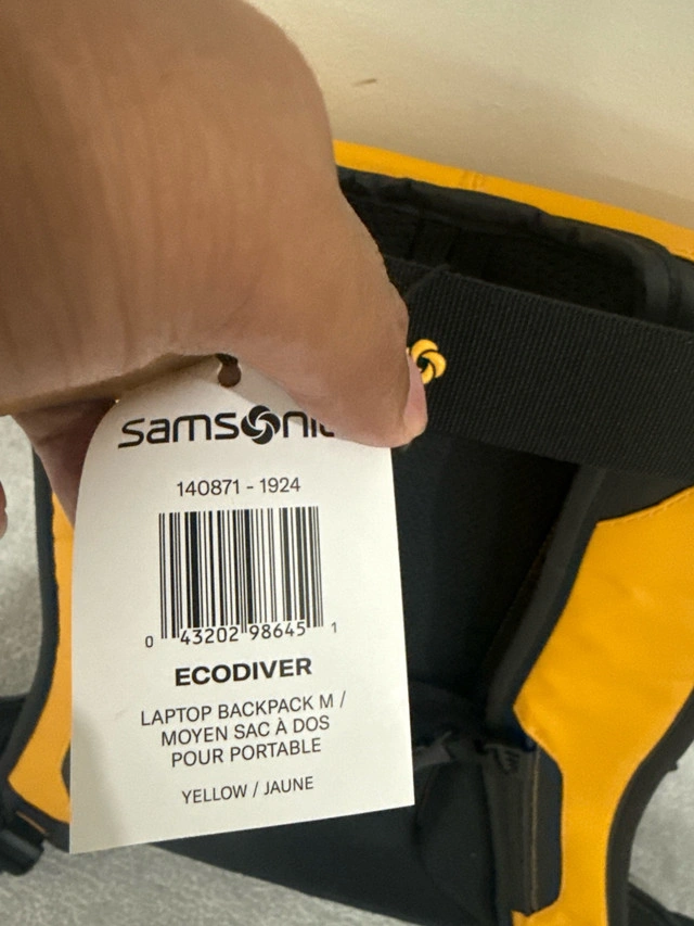 10Check out this brand new Samsonite Ecodiver Laptop Backpack in yellow! This stylish and functional backpack is perfect for carrying your laptop and other essentials. Here are some of its features: * Brand: Samsonite * Model: Ecodiver * Colour: Yellow * Condition: New with tags This backpack is looking for a new home to go on amazing adventures! Don't miss out on this opportunity to own a fantastic backpack.