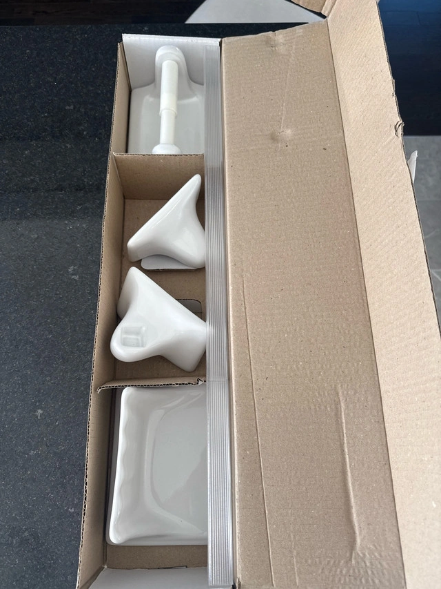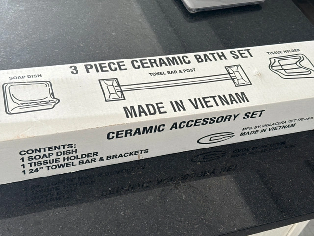 I'm offering a new 3-piece ceramic bath set, still in its original packaging. This set includes a soap dish, a tissue holder, and a 24-inch towel bar with brackets, all made in Vietnam. Perfect for adding a touch of elegance to any bathroom. If the ad is up, it's available!