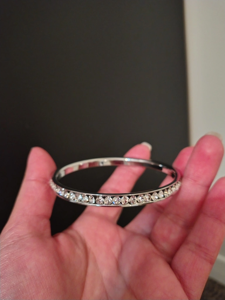 Selling a lovely silver tone bangle bracelet! It features a row of sparkling rhinestones that catch the light beautifully. It's in great condition and would make a wonderful addition to any jewelry collection