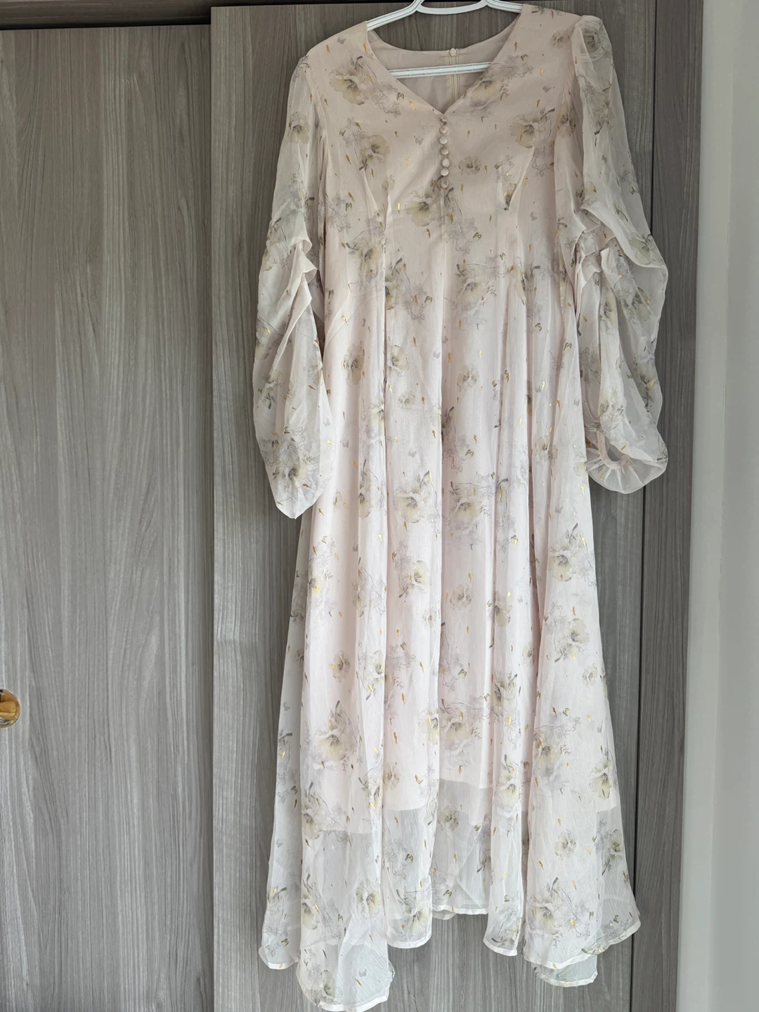 This is a beautiful floral print dress with long sleeves. It features a V-neck and button-down detailing. The dress is perfect for a special occasion or a casual day out. The material is lightweight and flowy, making it comfortable to wear.