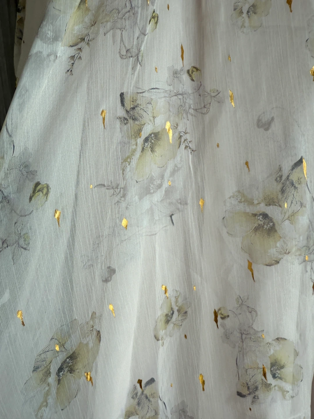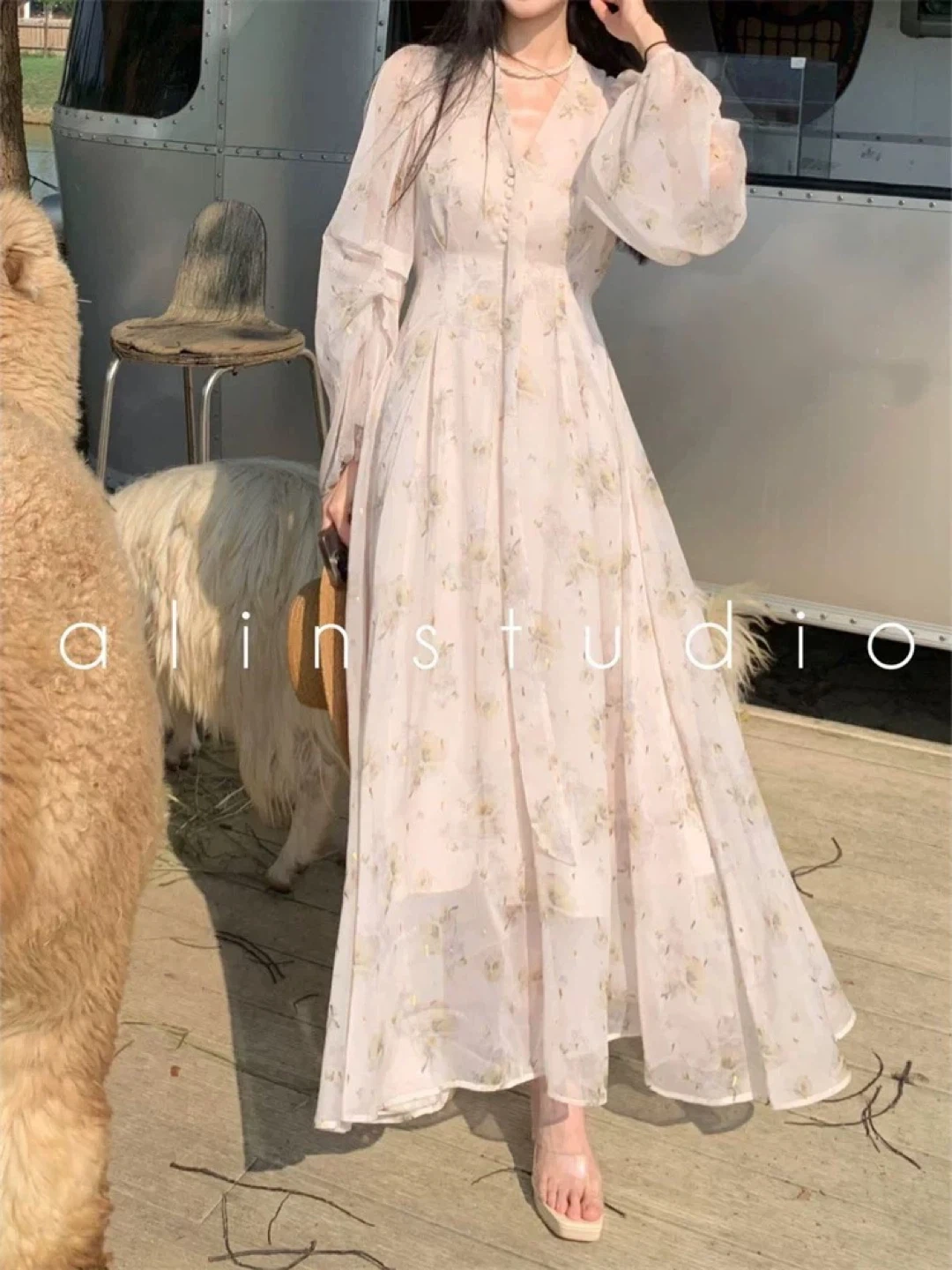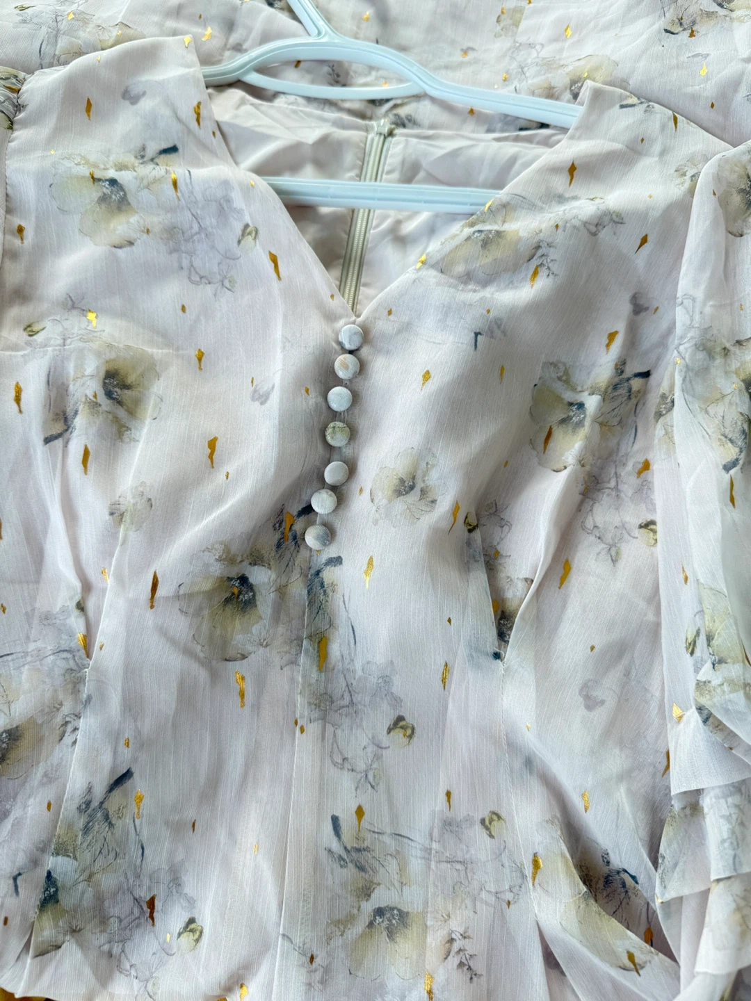This is a beautiful floral print dress with long sleeves. It features a V-neck and button-down detailing. The dress is perfect for a special occasion or a casual day out. The material is lightweight and flowy, making it comfortable to wear.