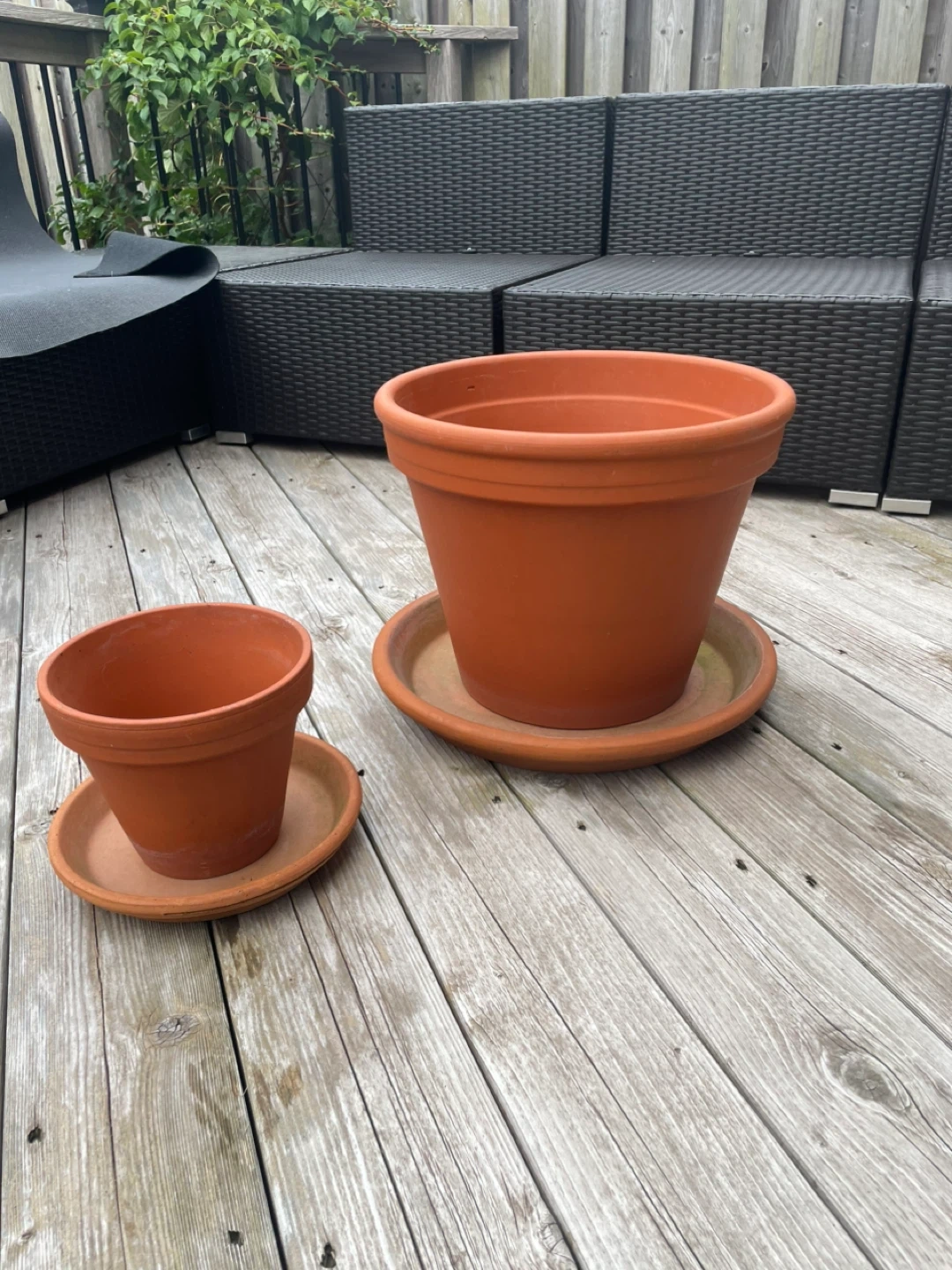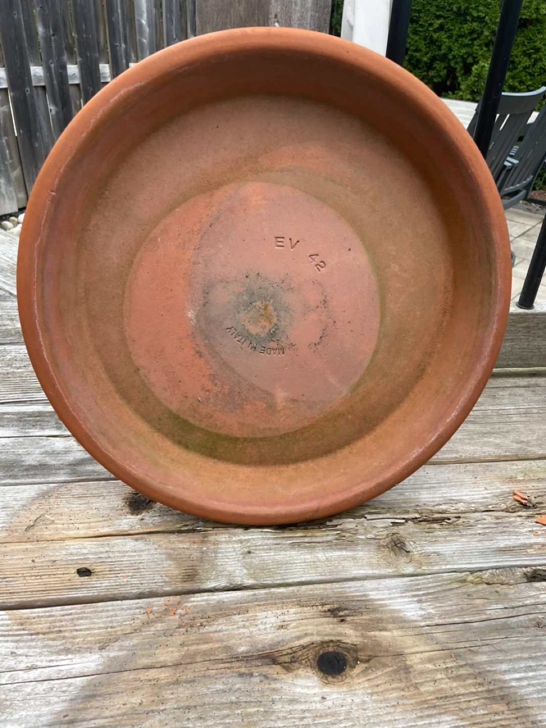 Clay saucers included but both have chips (17” diameter & 9-3/4” diameter)