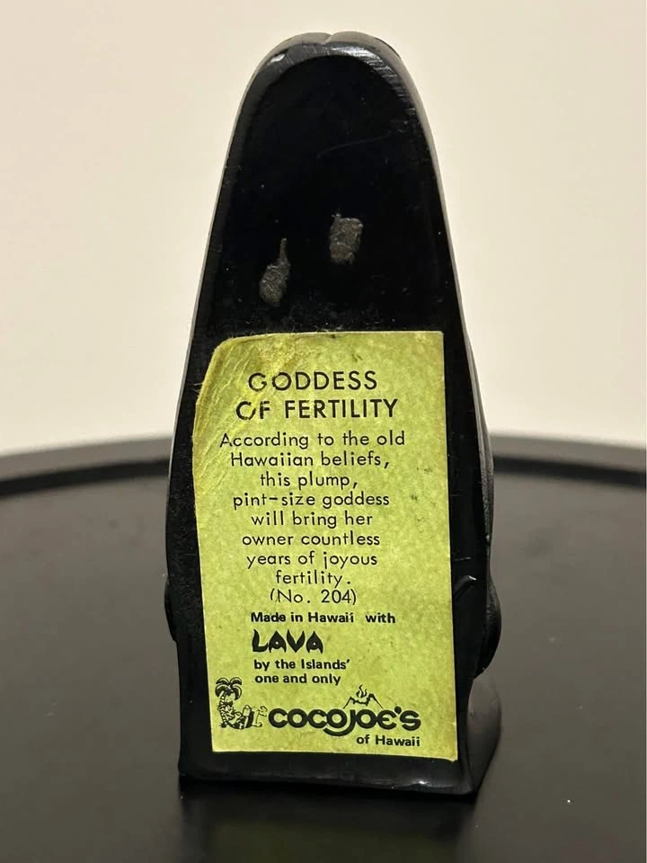 Authentic vintage Coco Joe’s “Goddess of Fertility” figurine (No. 204), made in Hawaii from crushed lava rock and resin. This collectible piece represents an old Hawaiian fertility goddess, believed to bring joy, prosperity, and abundance to its owner. Features original label and base marking: “Made with Lava by Coco Joe’s of Hawaii.” A classic mid-century Hawaiian souvenir — perfect for collectors of Polynesian art, tiki decor, or lava stone figures. Pick up: Seton area, Calgary. See also my other lots. Open to your questions and suggestions. If necessary, I provide additional photos. These are not new things, so please look carefully at the photos and videos.