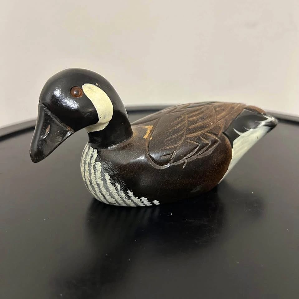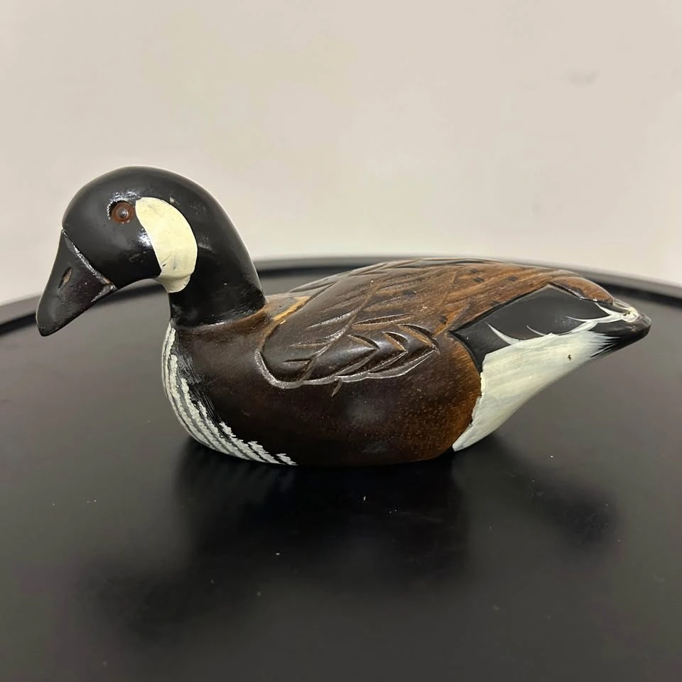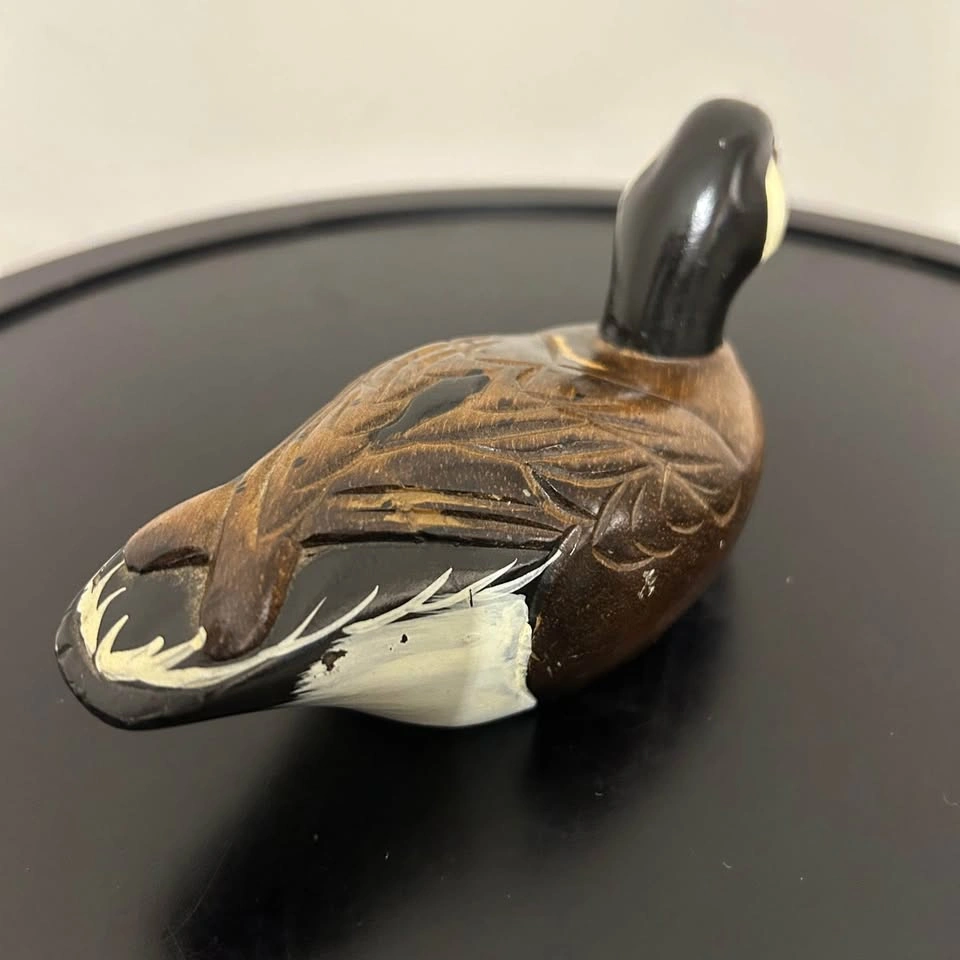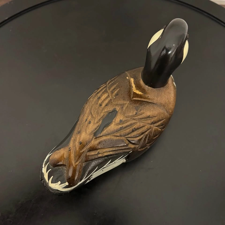 Charming hand-carved and painted wooden duck figurine. Nicely detailed feather carving and painted features with warm tones of brown, black, and white. Measures about 6 inches long (see photo for scale). A lovely rustic accent for cabin, cottage, or shelf decor. Some small paint wear consistent with age. Pick up in the Seton area, Calgary. See also my other lots. Open to your questions and suggestions. If necessary, I provide additional photos. These are not new things, so please look carefully at the photos and videos.