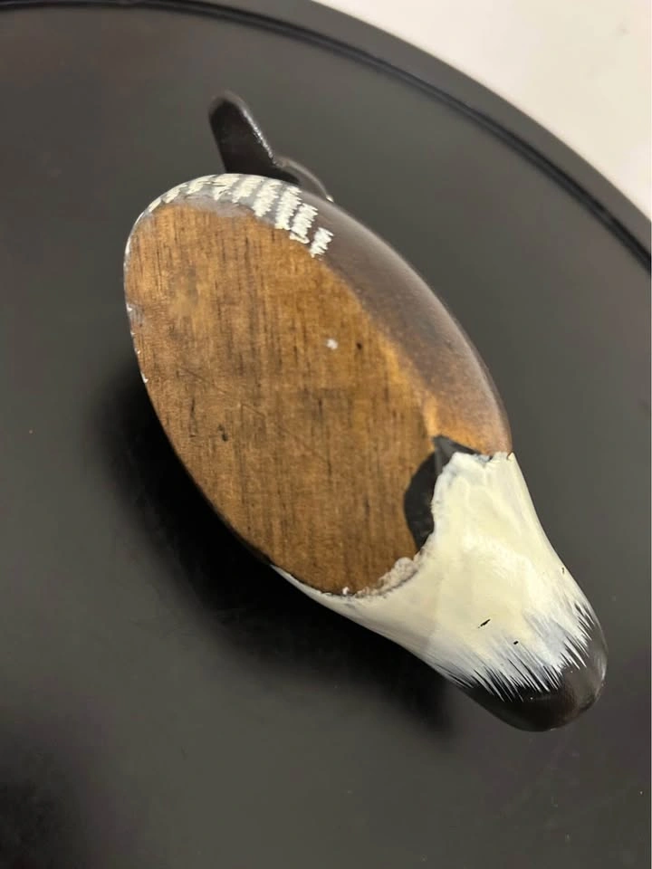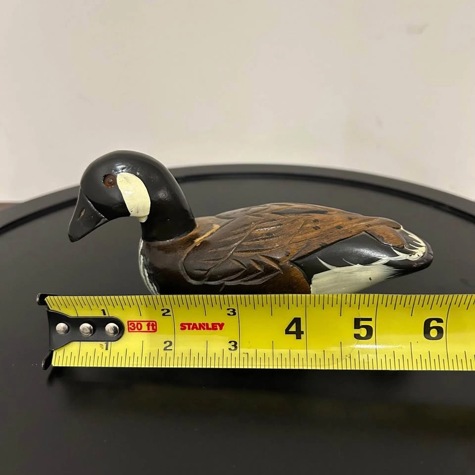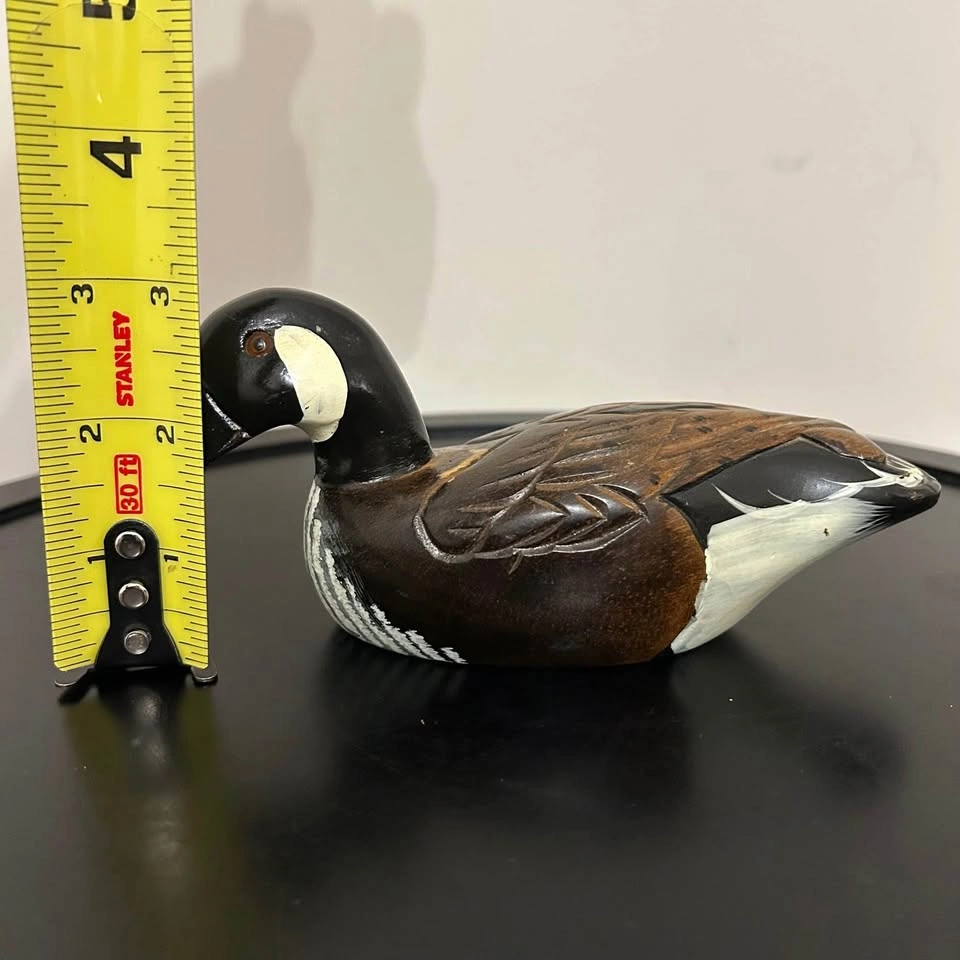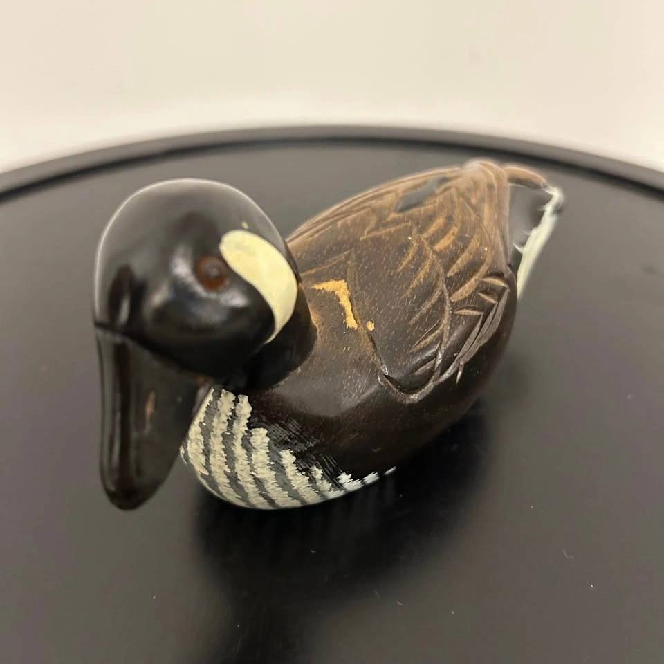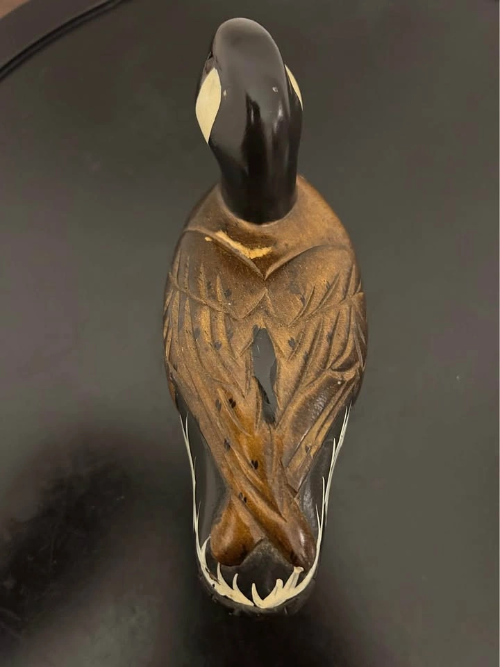 Charming hand-carved and painted wooden duck figurine. Nicely detailed feather carving and painted features with warm tones of brown, black, and white. Measures about 6 inches long (see photo for scale). A lovely rustic accent for cabin, cottage, or shelf decor. Some small paint wear consistent with age. Pick up in the Seton area, Calgary. See also my other lots. Open to your questions and suggestions. If necessary, I provide additional photos. These are not new things, so please look carefully at the photos and videos.