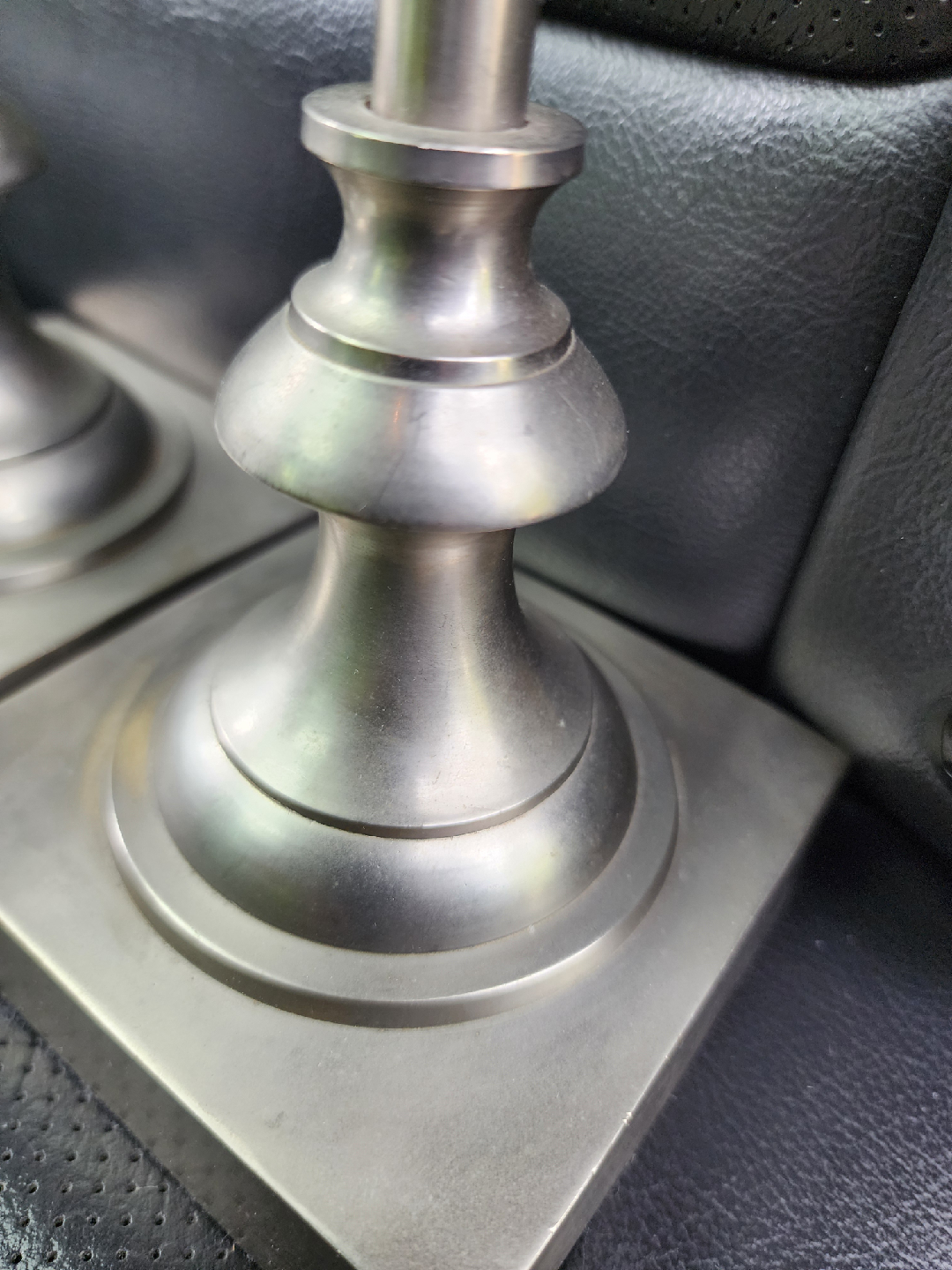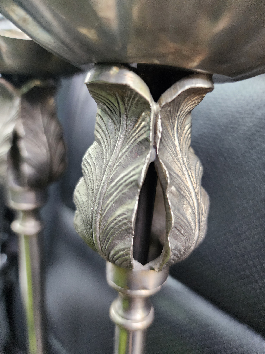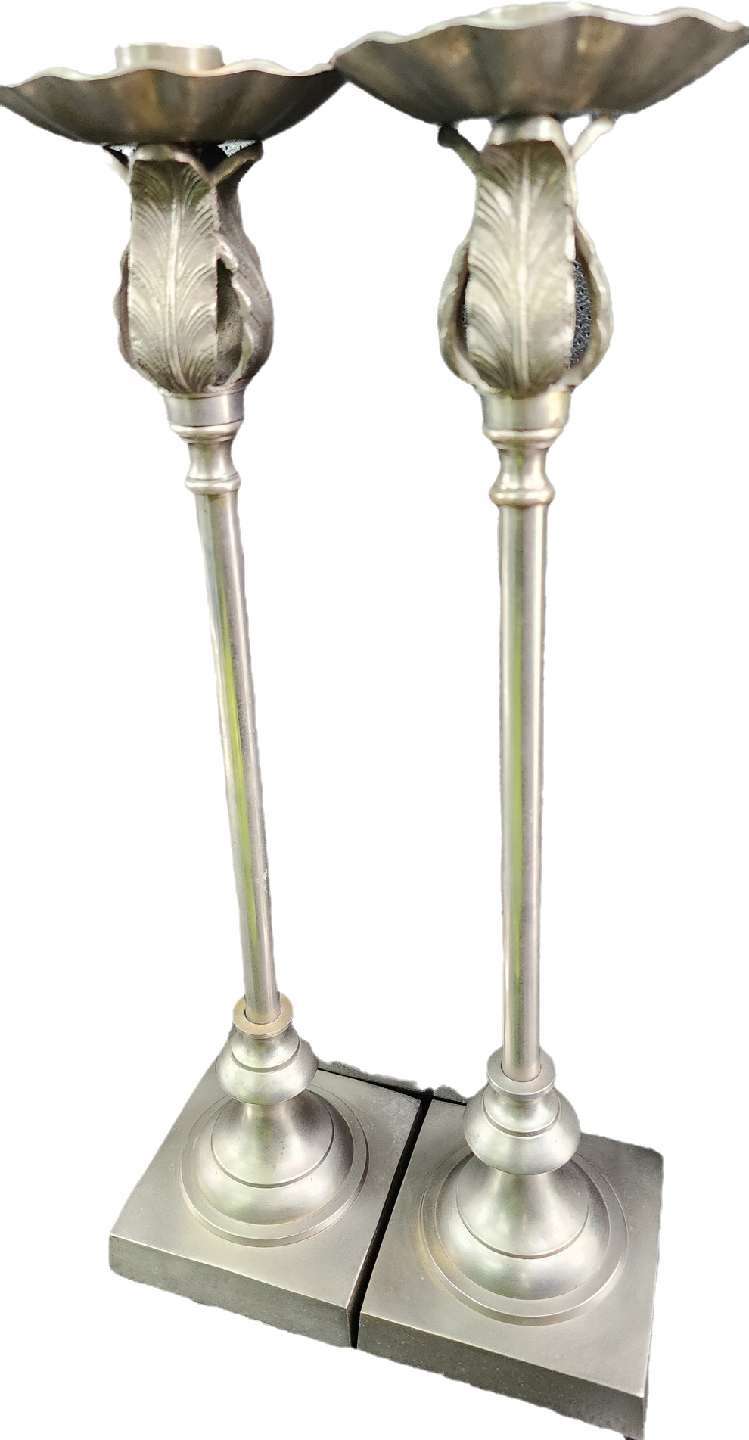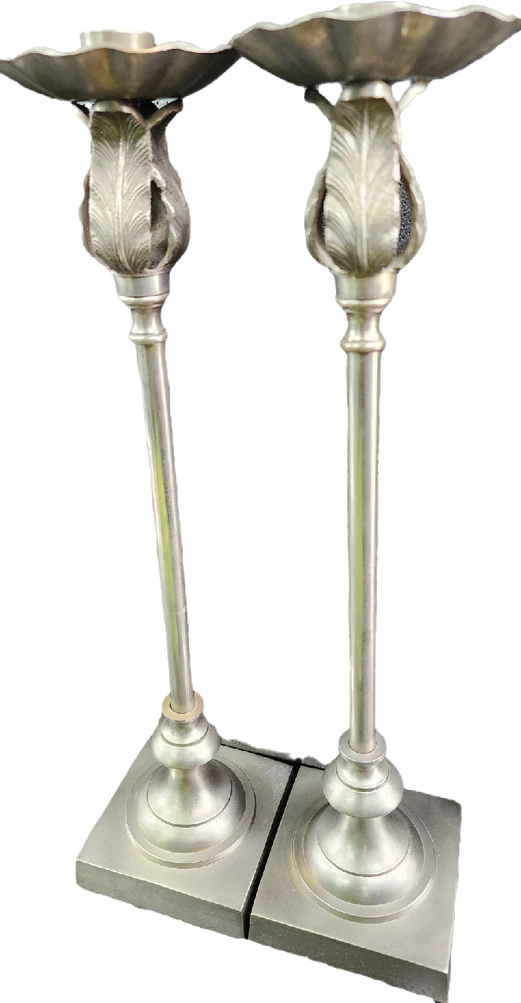 Selling a set of two Brass Candlestick holders. They have a beautiful, ornate design with a square base and a leaf-like feature near the top. These would add a touch of elegance to any room!