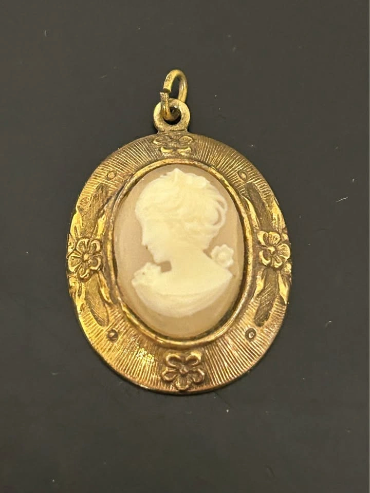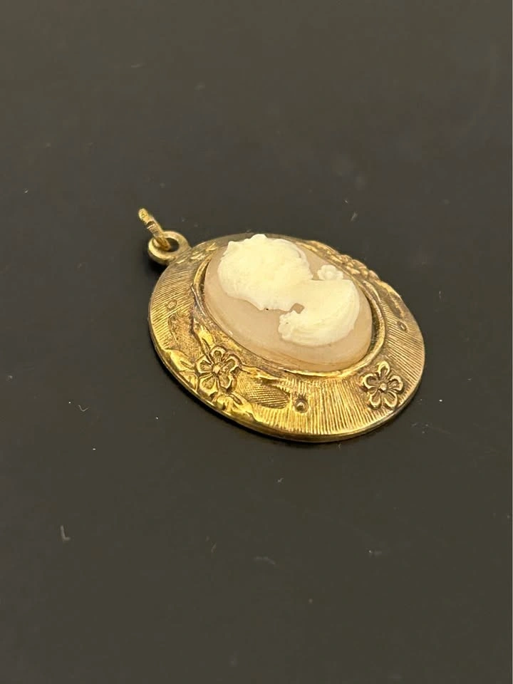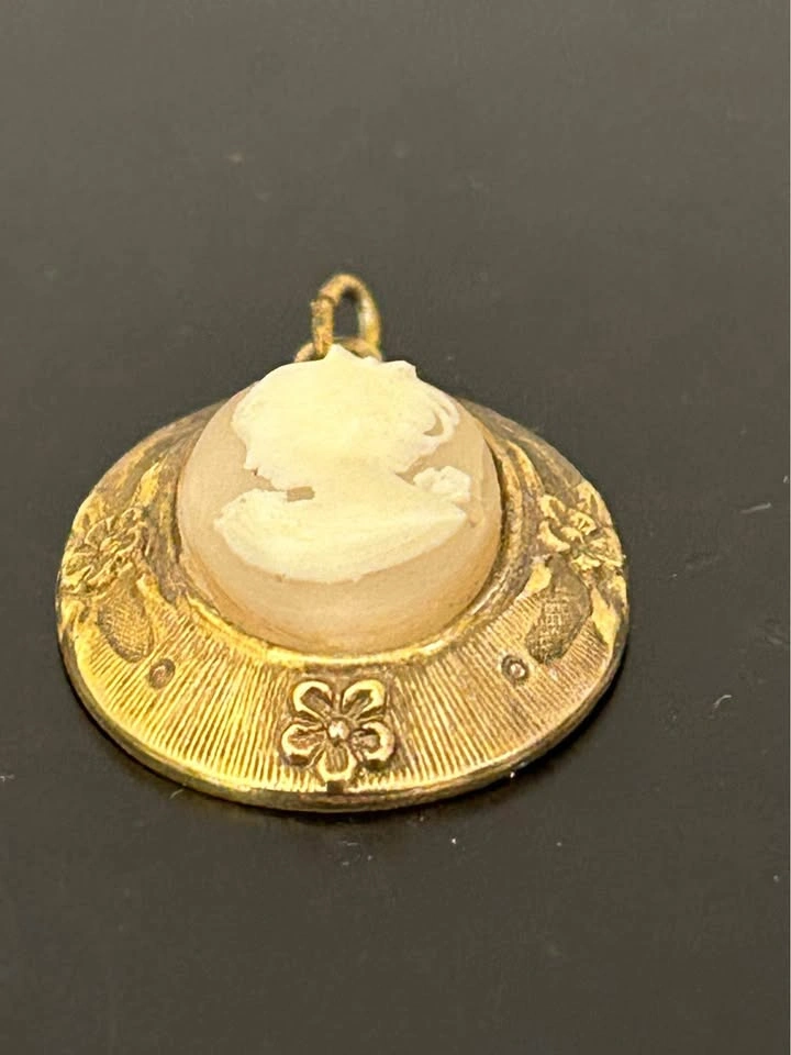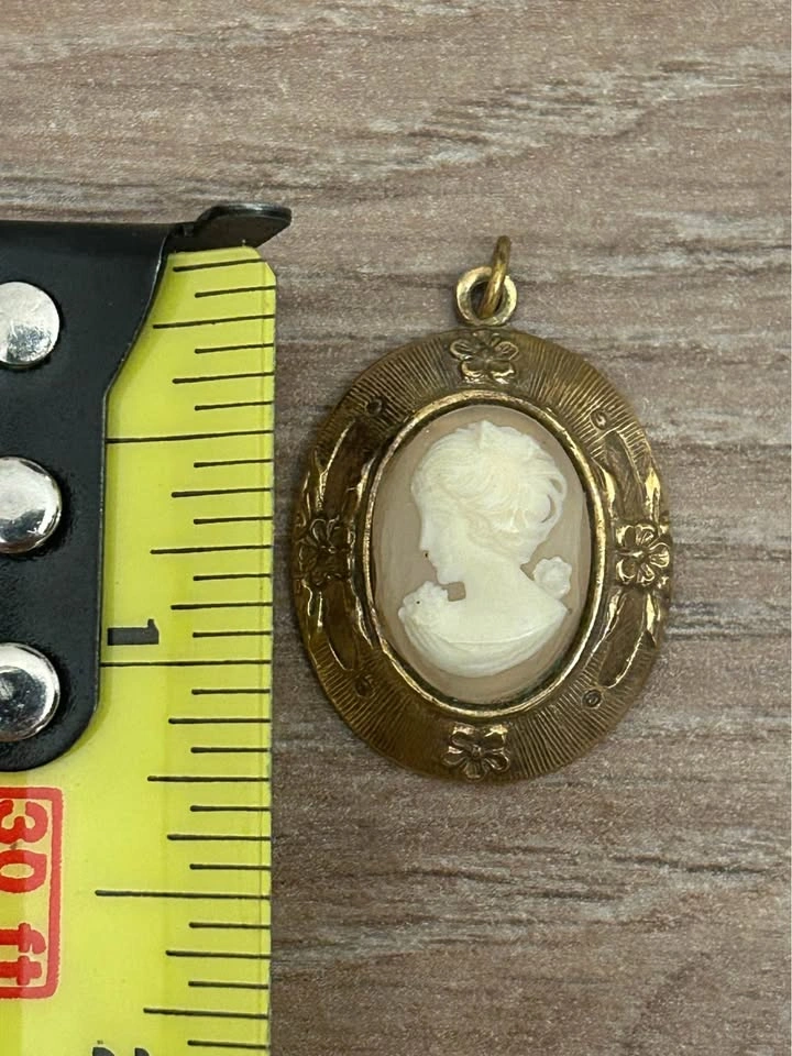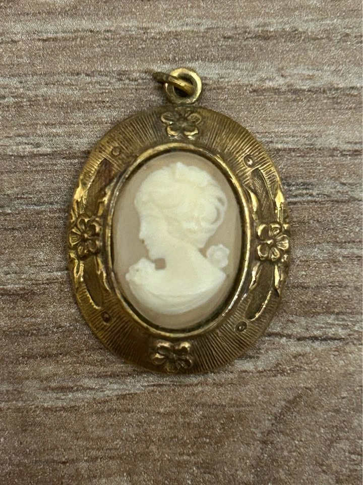 Charming vintage cameo pendant featuring a hand-carved profile of a lady in a raised relief shell, set within a decorative brass-tone floral frame. This elegant piece reflects classic Victorian-inspired design and fine craftsmanship. Material: carved shell cameo in a brass-tone metal setting. Condition: vintage patina and minor wear consistent with age. Perfect as a pendant, charm, or collectible display piece. Pick up: Seton area, Calgary. See also my other lots. Open to your questions and suggestions. If necessary, I provide additional photos. These are not new things, so please look carefully at the photos and videos.