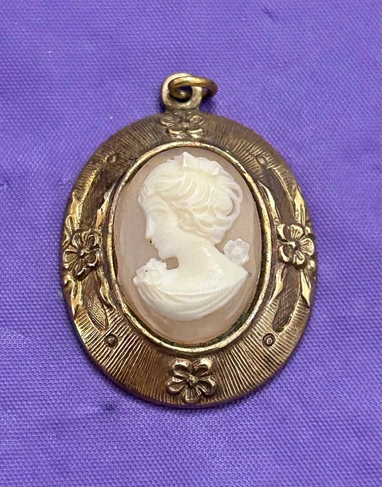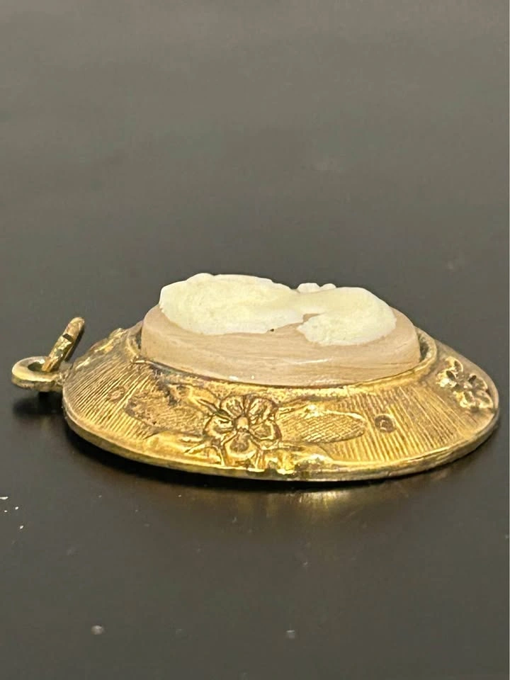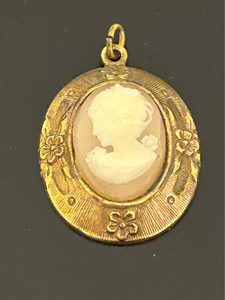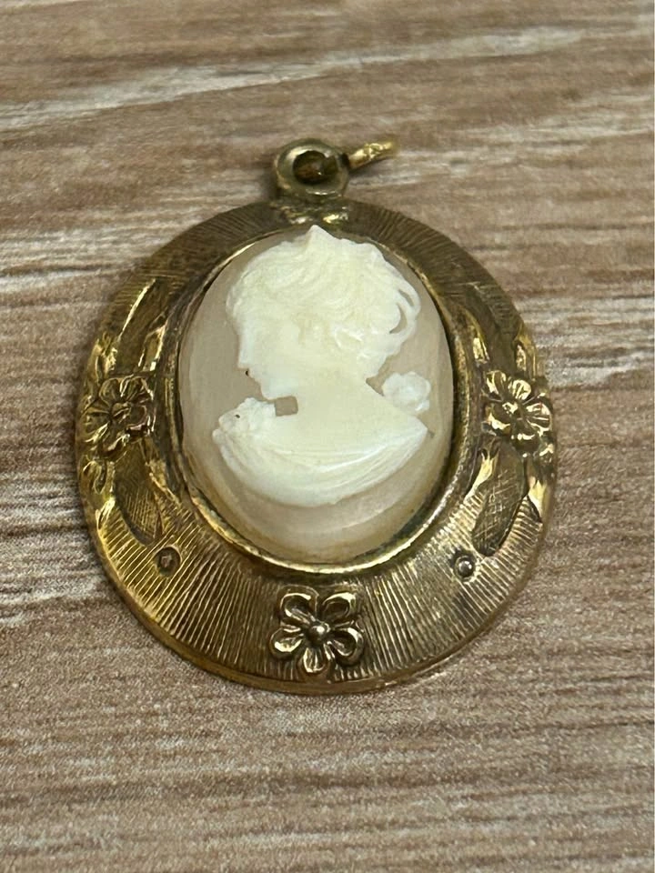 Charming vintage cameo pendant featuring a hand-carved profile of a lady in a raised relief shell, set within a decorative brass-tone floral frame. This elegant piece reflects classic Victorian-inspired design and fine craftsmanship. Material: carved shell cameo in a brass-tone metal setting. Condition: vintage patina and minor wear consistent with age. Perfect as a pendant, charm, or collectible display piece. Pick up: Seton area, Calgary. See also my other lots. Open to your questions and suggestions. If necessary, I provide additional photos. These are not new things, so please look carefully at the photos and videos.
