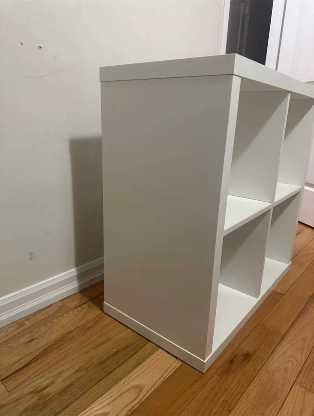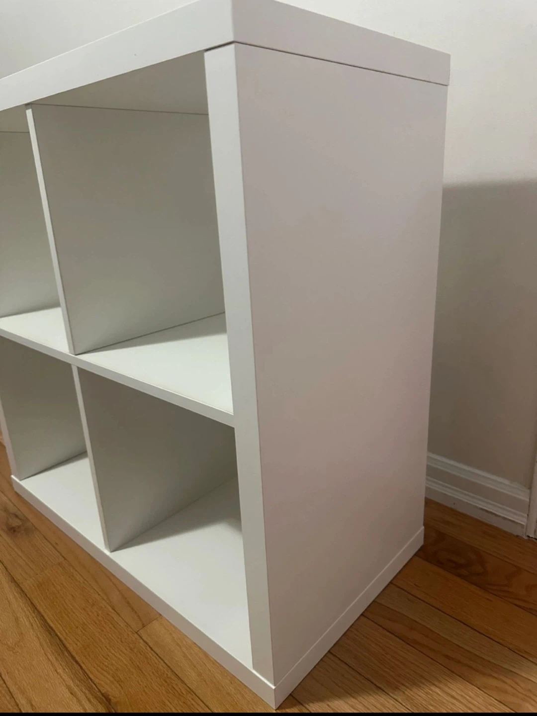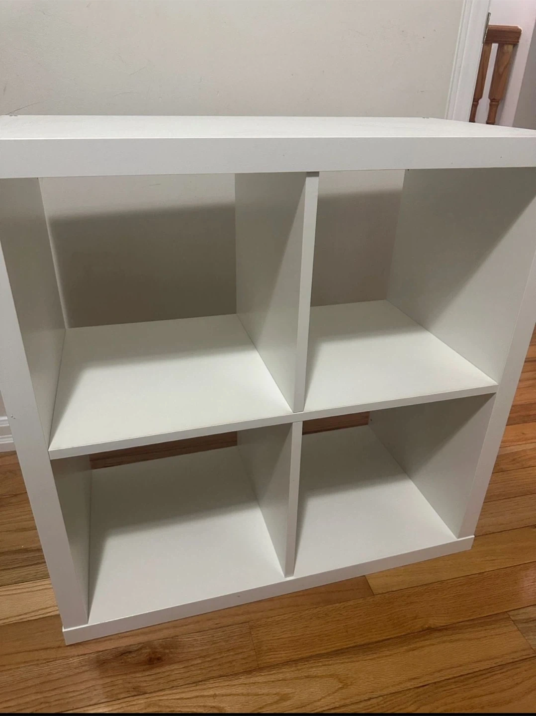 Selling a handy white storage cube shelf! It's in great shape and perfect for organizing books, toys, or anything else you need to keep tidy. It has four cubes, offering plenty of space. A simple and versatile piece for any room!