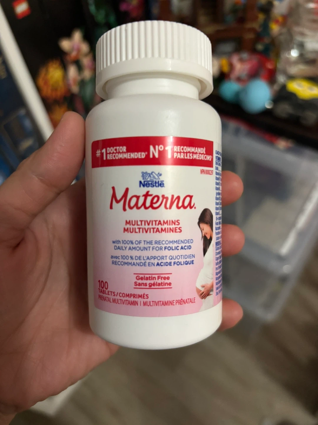 Selling a bottle of Nestle Materna prenatal multivitamins. Each tablet provides 100% of the recommended daily amount of folic acid. They are gelatin free and ideal for pre-conception, pregnancy, and breastfeeding. The expiration date is June 2026. Retails for $23.38