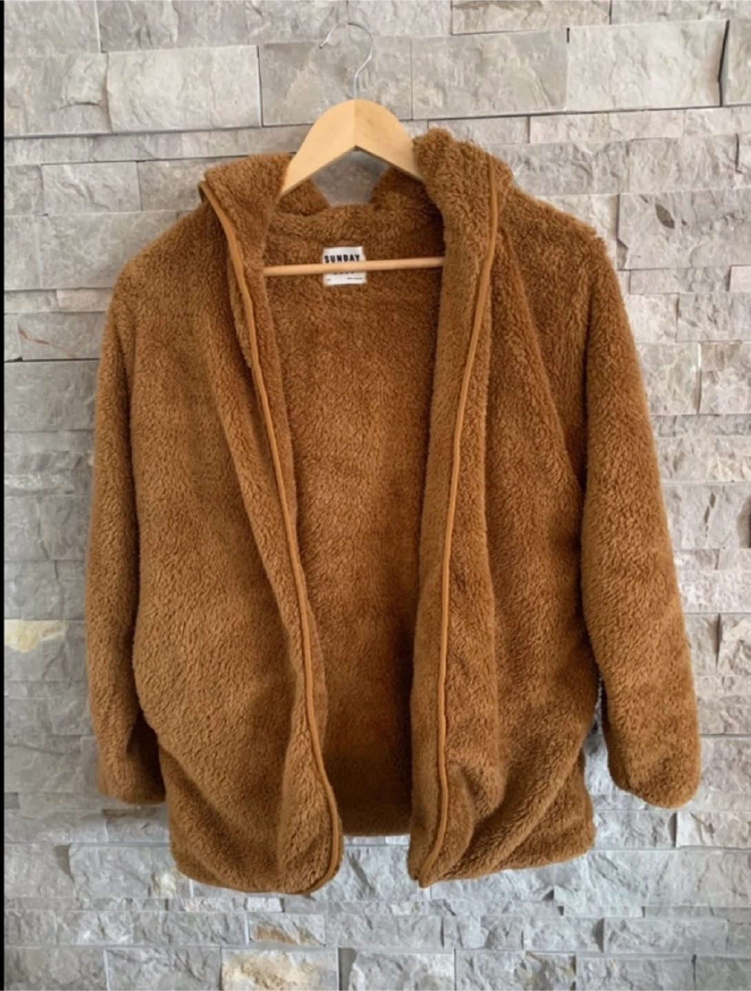 ARITZIA Alisya cosy teddy cardigan. Relaxed fit. Hooded. Colour is brûlée. Open front. No closure. Lined pocket. Machine washable. Very good condition.
