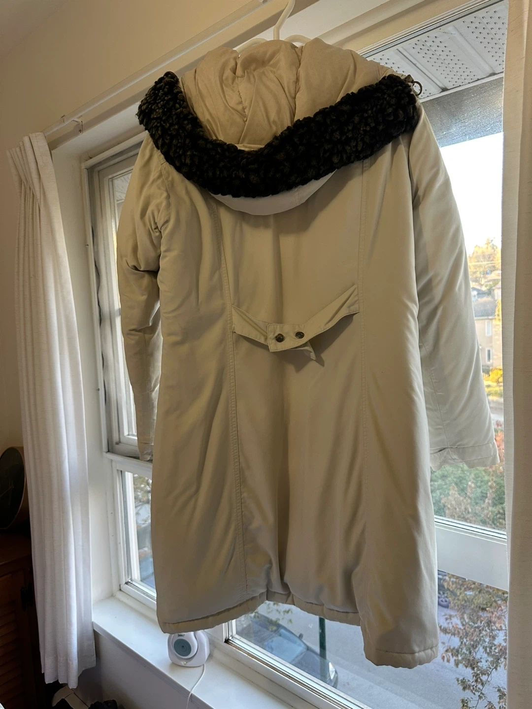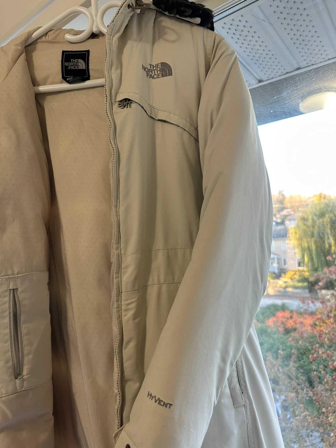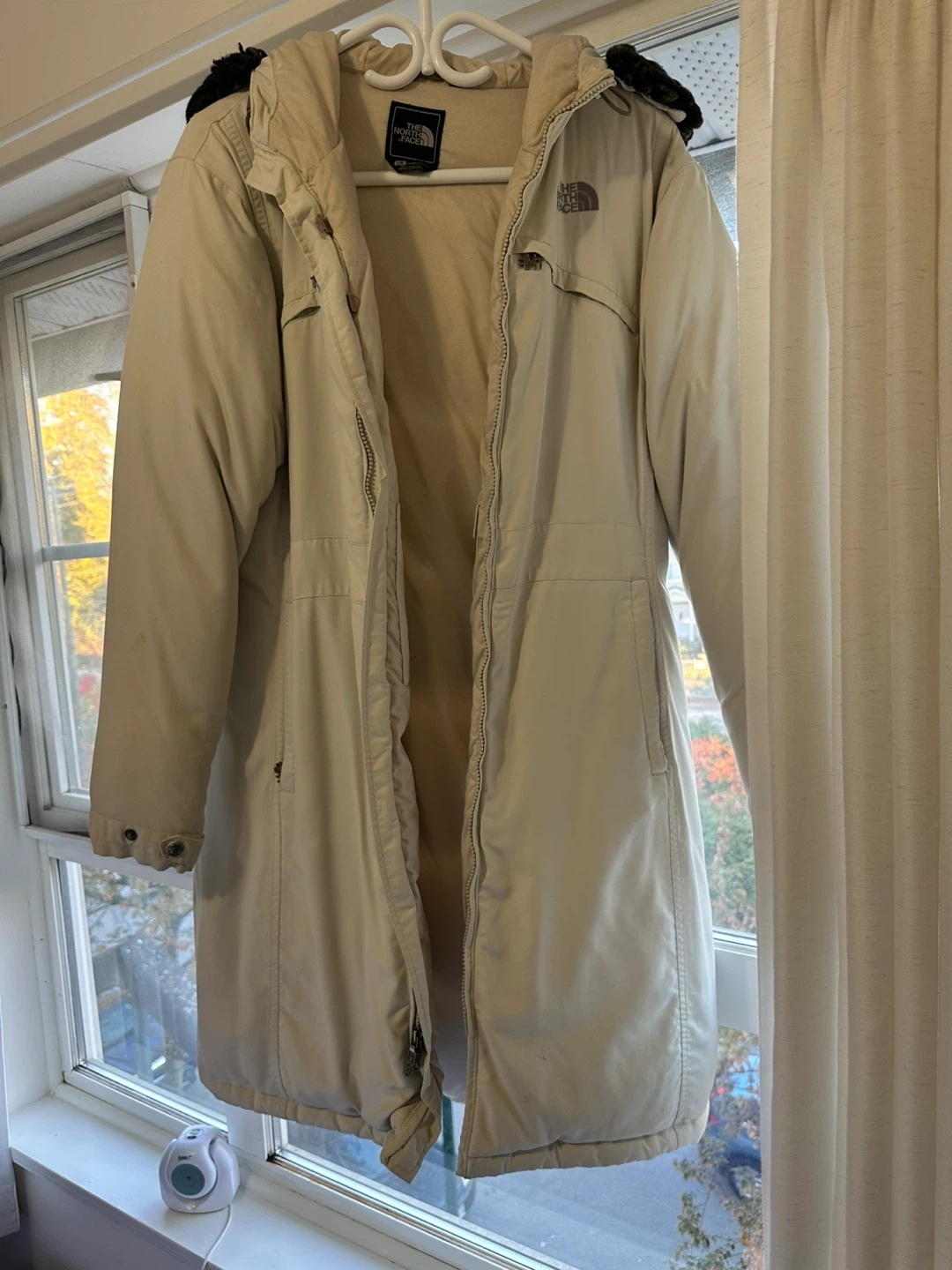 Selling a The North Face winter parka in a lovely beige colour! large size . Perfect for staying warm during those cold Canadian winters!