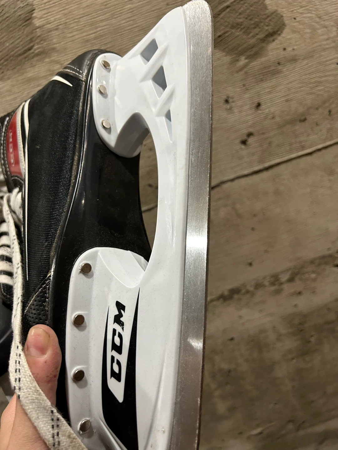 Selling a pair of CCM Intruder ice hockey skates. They are black, white, and red. The size is 10 US.