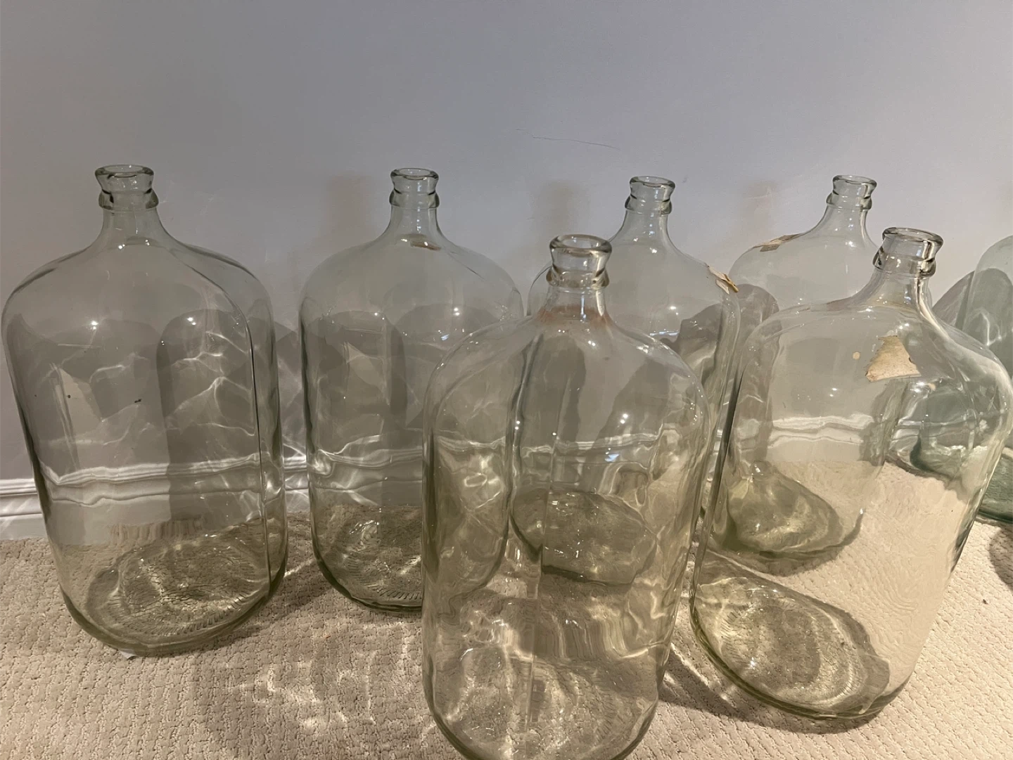 Selling a set of 6 glass carboys! These are great for homebrewing, wine making, or even as decorative pieces. They're in good condition and ready for a new home. Perfect for your next project or hobby. $20 each. Take all 6 for $80