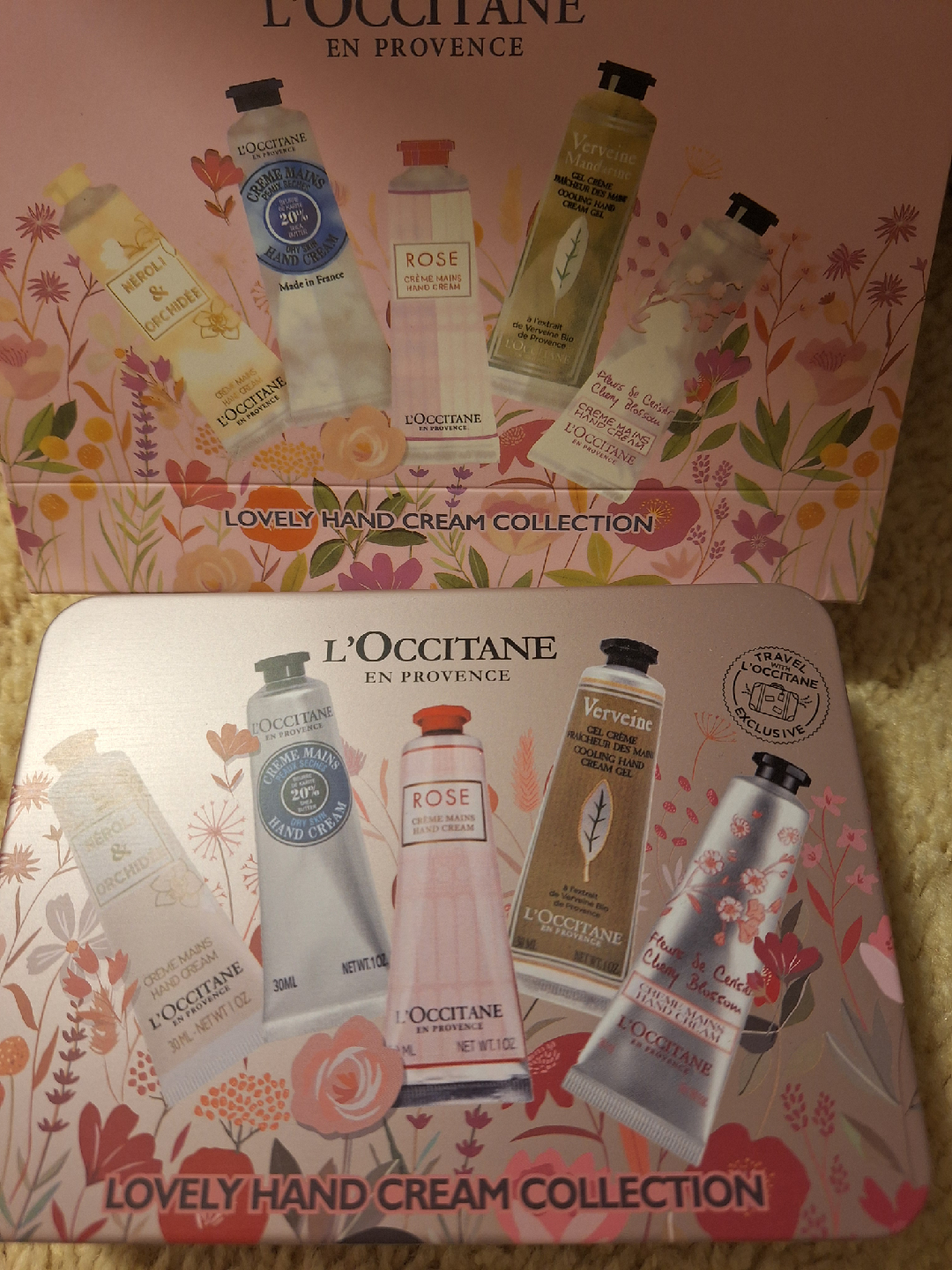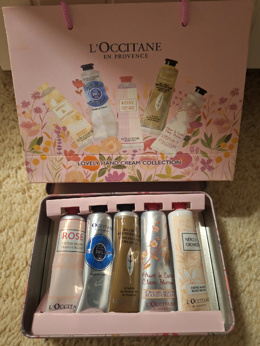 Brand new L'Occitane Hand Cream Collection. 5 tube of 30g hand creams: Rose, Shea Butter, Verbena, Cherry Blossom, and Neroli & Orchidee. Comes in a nice tin and matching gift bag.