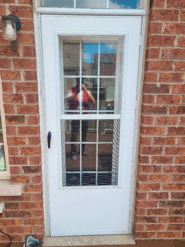 Used. Working good. Door is 31-3/8 x 79-3/8 for 32 x 80 size. Missing 1 piece. Only can use as screen door. Door closer not working and already throw out. Pickup in Newmarket.