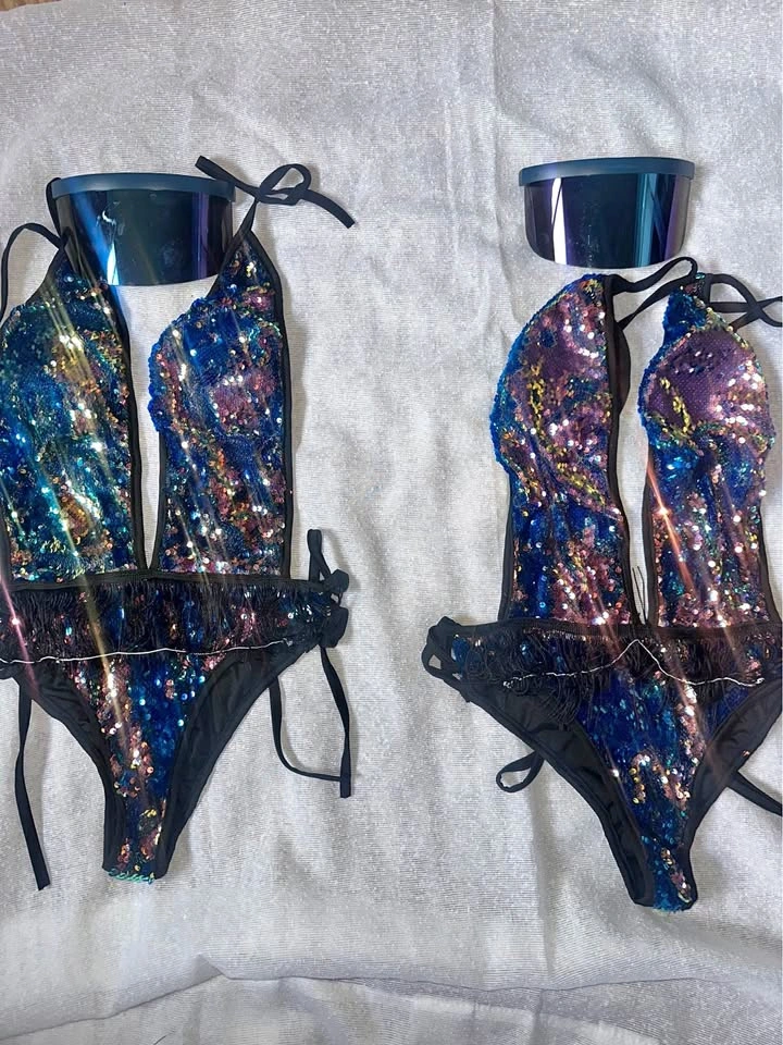 Make it what you want but the sparkly sequins and reflective visor works as a space explorer or alien queen outfit. 2 available in size small. 2 available in size medium. 2 available in size large. 35$ per set of 1 visor 1 bodysuit