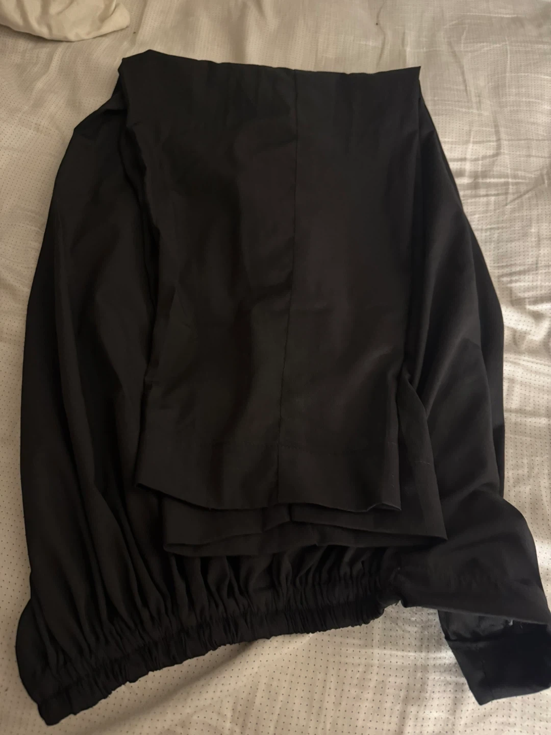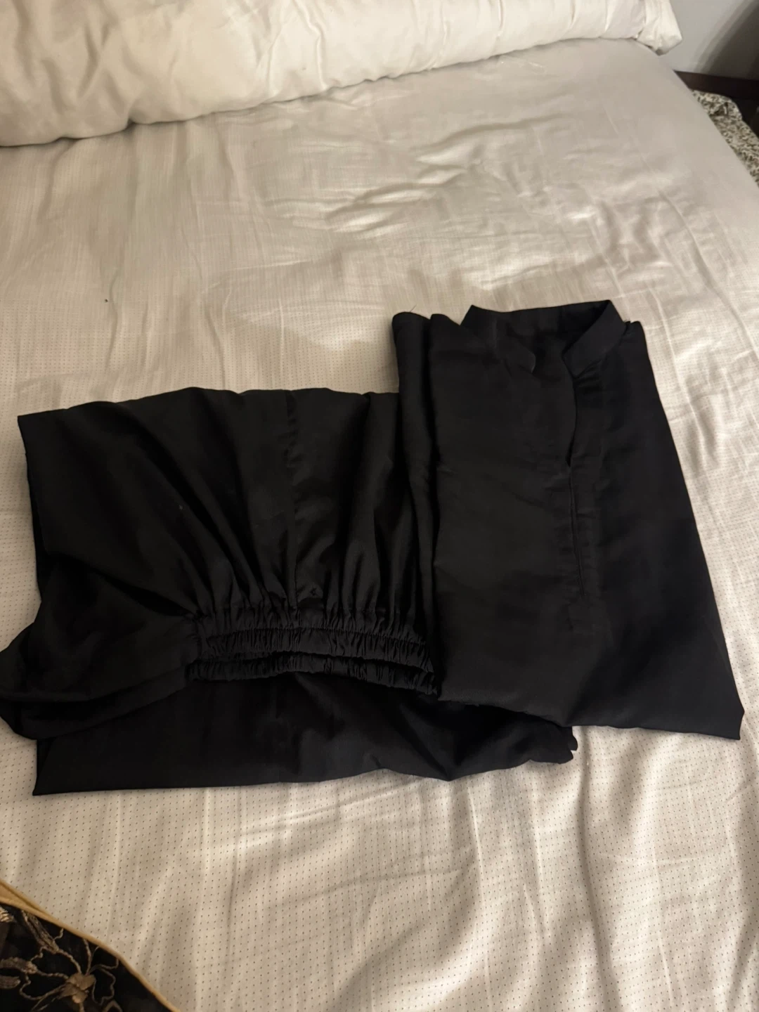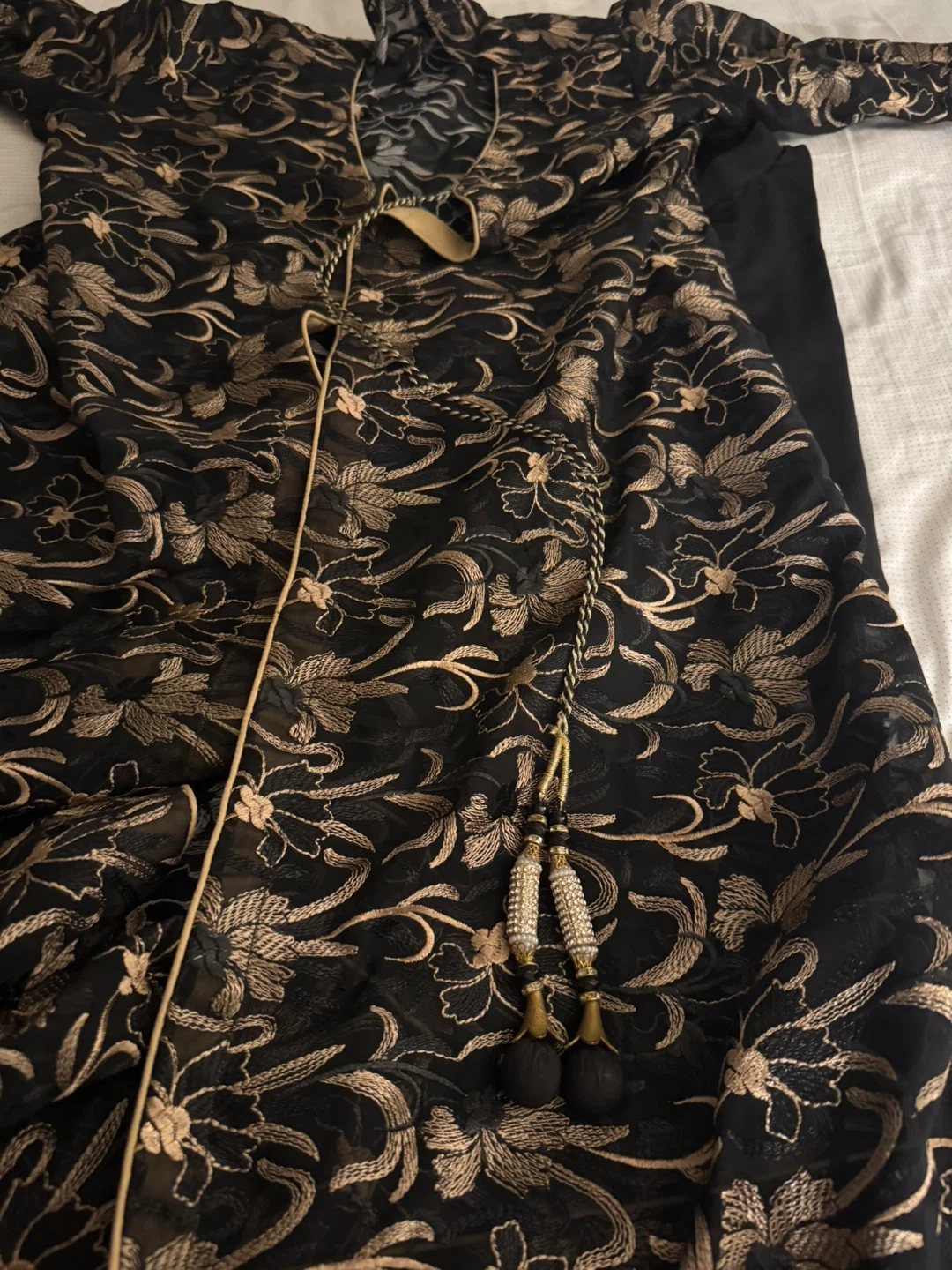109Beautiful black and gold embroidered net lace gown with black shirt and trouser outfit. The material has a lovely floral design embroidery. Worn twice only perfect condition just like new no damage at all. Material is high quality. Perfect for special occasions or adding a touch of elegance to your wardrobe.