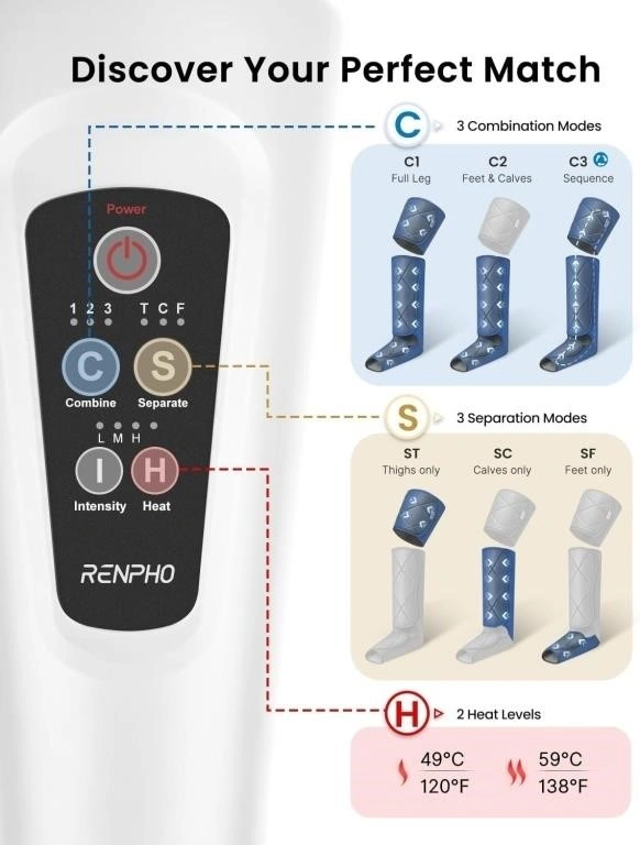 Looking to sell my RENPHO air compression leg massager. It's in great shape and ready to help you relax! - Model: RP-ALM070H - Input: 12V=2A - Rated Power: 24W - Auto-off Timer: 20 mins It features 3 combination modes and 3 separation modes, plus 2 heat levels to customize your massage experience