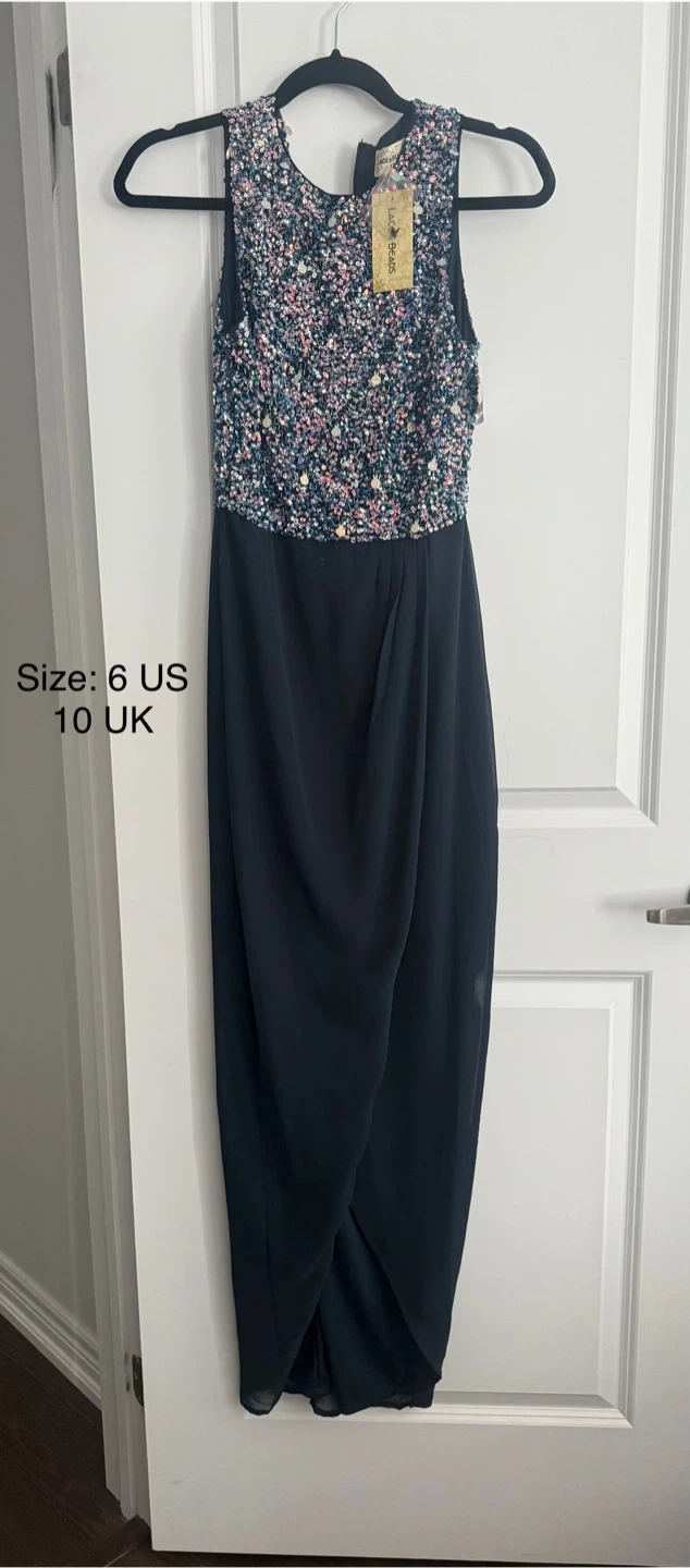 Selling a beautiful Lace & Beads dress. It's a size 6 US or 10 UK. The dress features a lovely sequined bodice and a flowing black skirt. Perfect for a special occasion!