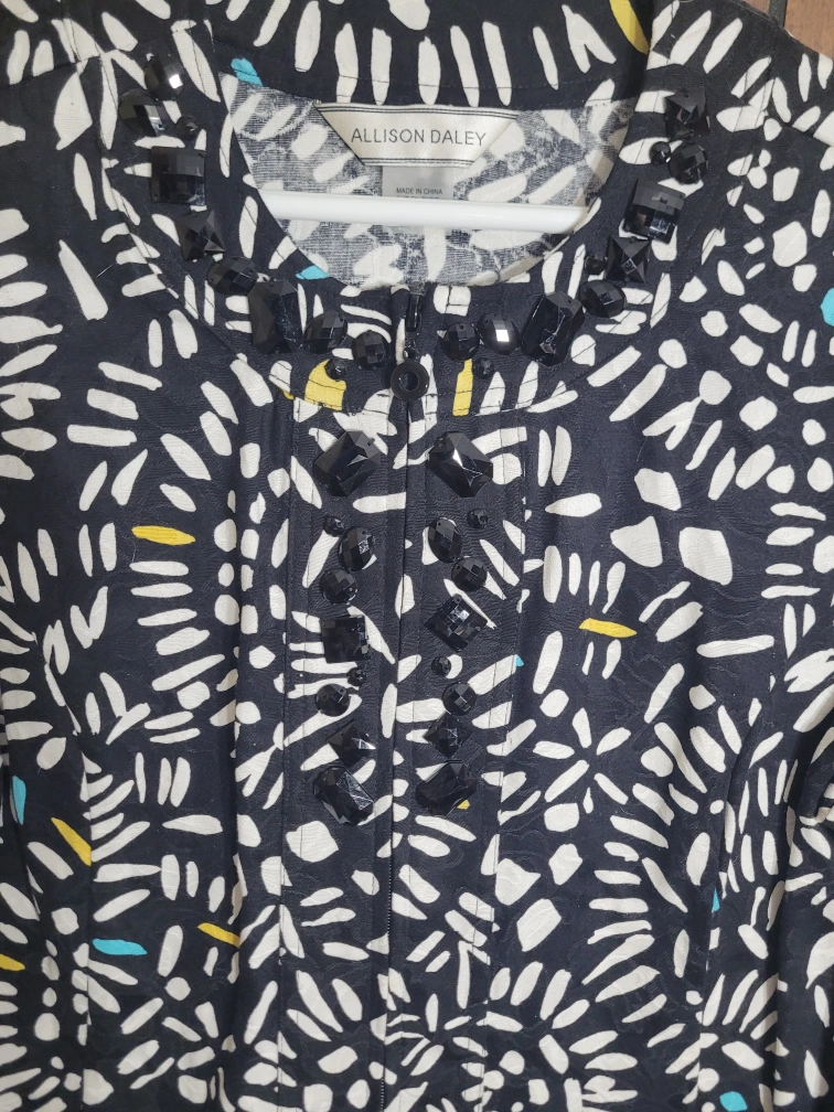 Selling a gently used Allison Daley jacket in size 10. It features a unique black and white pattern with accents of yellow and blue. The jacket has a stylish design with decorative embellishments around the neckline. Perfect for adding a touch of flair to any outfit!