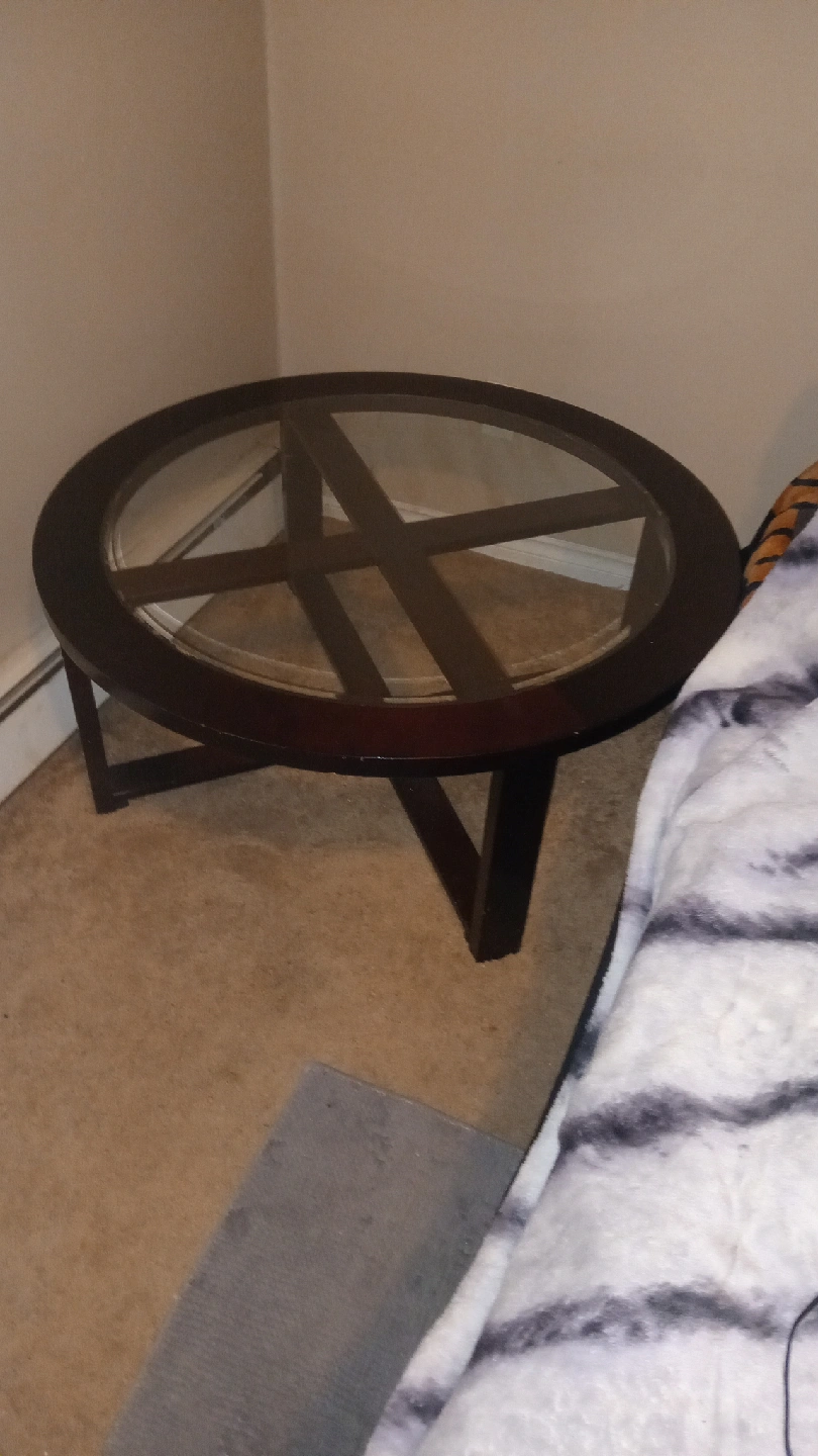 Selling a used round coffee table with a glass top. It has a brown wooden frame and a unique design. Perfect for adding a touch of elegance to your living room!