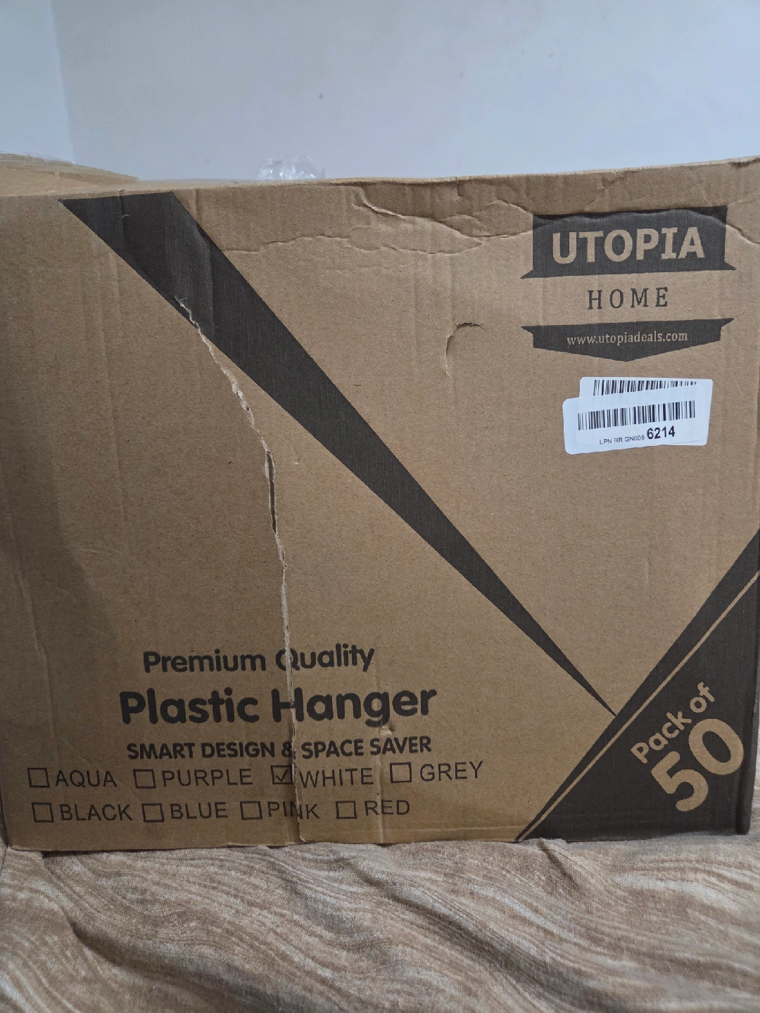 83Selling a box of Utopia Home plastic hangers! These are premium quality hangers designed to save space. The box indicates the hangers are white. Perfect for keeping your closet organized! pack of 50