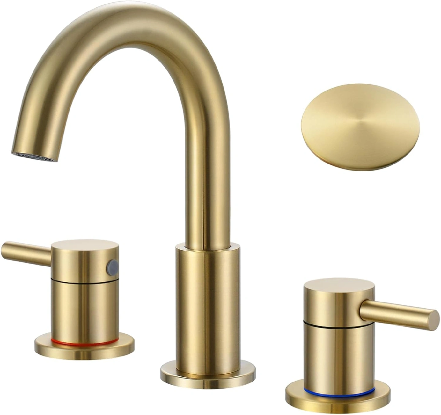 231Brand new brushed gold bathroom faucet for sale. 3 hole, 2 handle, 8” inch basin, pop-up drain included, $50 FIRM. faucet, water, reno, vanity, counter, water, bathroom, sink, renovation, hose, plumbing, kitchen, drain, shower, tub, bath, bathtub, swivel, pull down, pull out, spray, nozzle, handle, Moen, Delta, dishes, column, tower, massage, jets, LED, temperature, valve, rainfall, waterfall, wand, spout