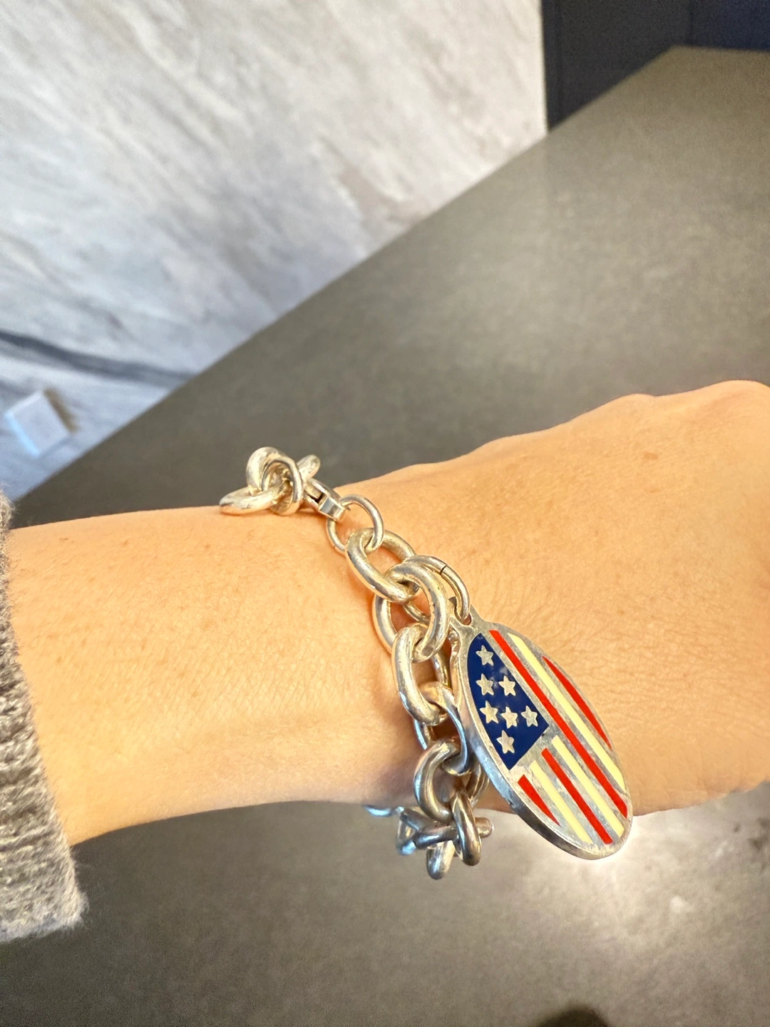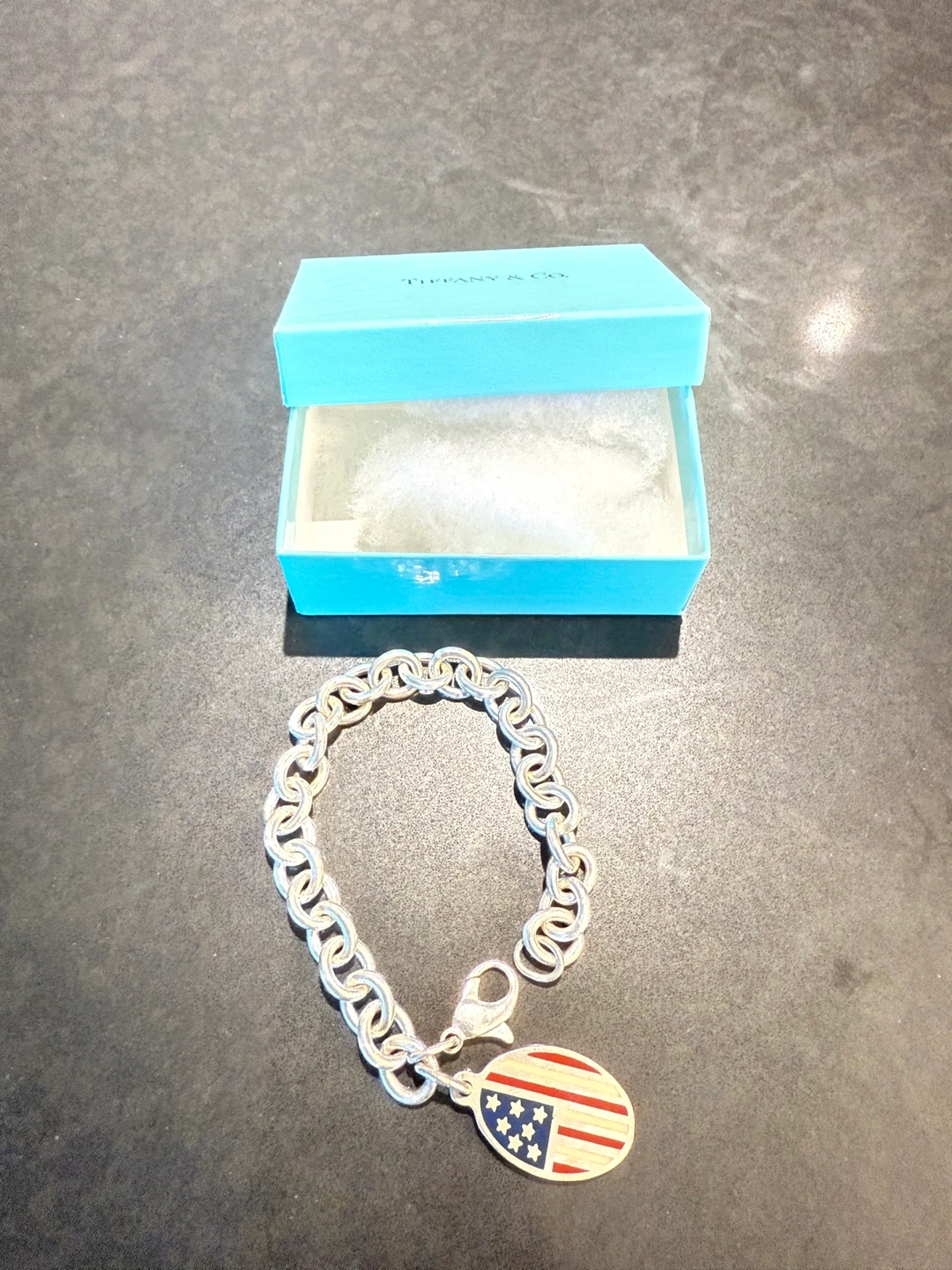 Selling a Tiffany & Co. charm bracelet. It comes with its original box. The bracelet features a charm with an American flag design. A charming piece for any collection!