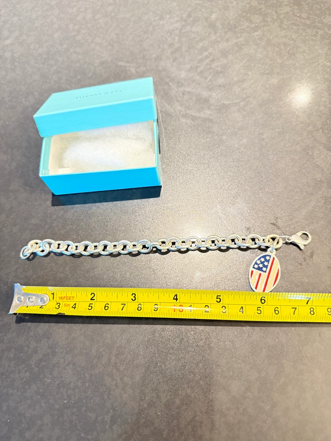 Selling a Tiffany & Co. charm bracelet. It comes with its original box. The bracelet features a charm with an American flag design. A charming piece for any collection!