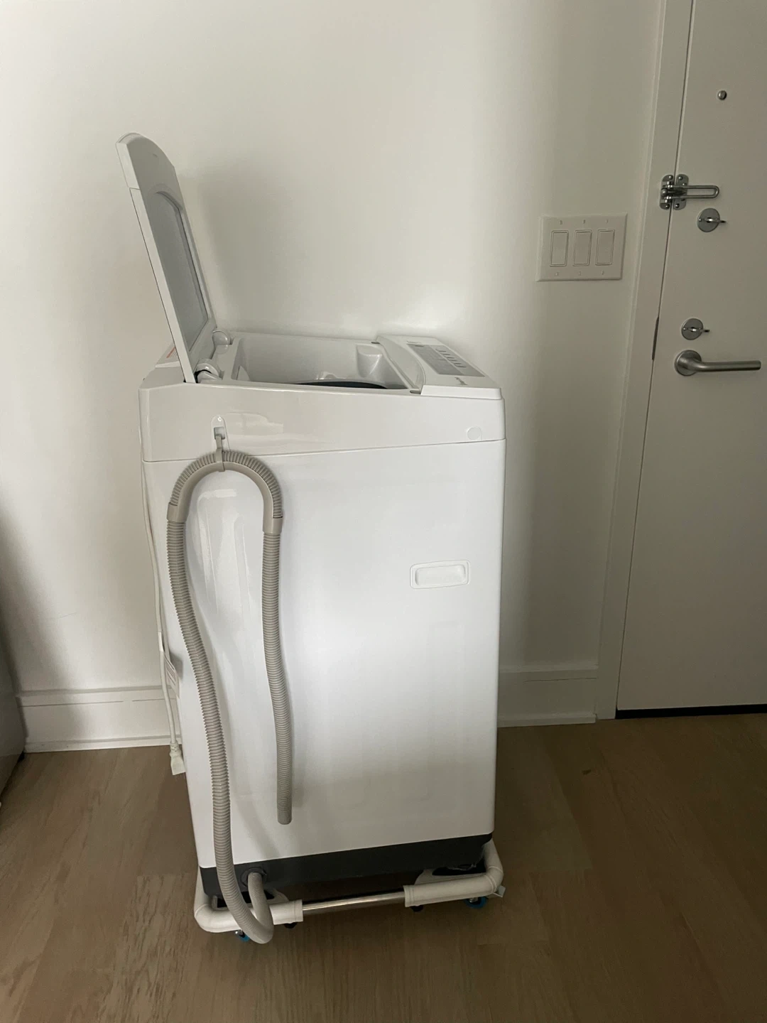 It's barely been used and perfect for apartments or smaller spaces. It's white and comes with all the necessary hoses for hookup to your tap!