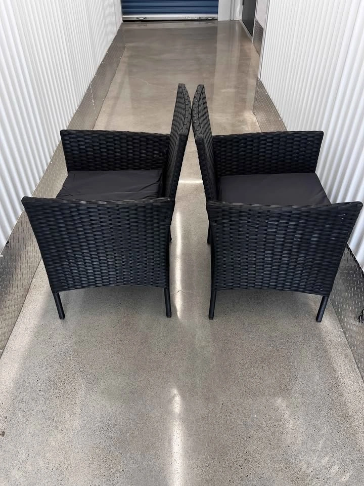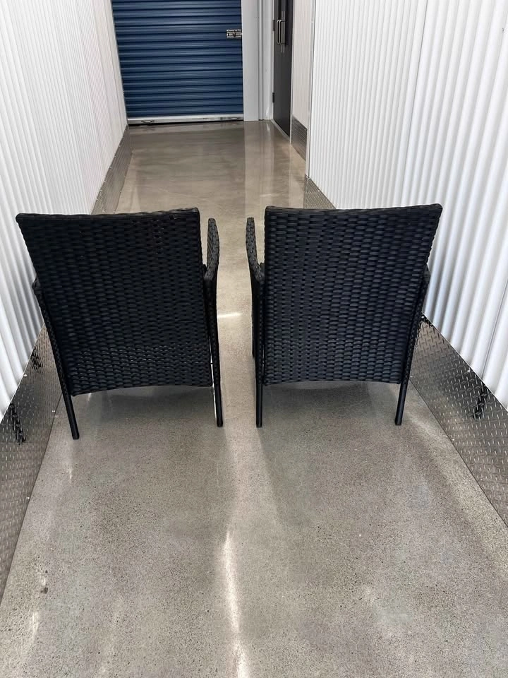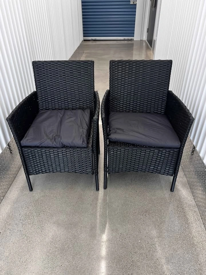49Modern and weather-resistant, this set of 2 black rattan chairs is perfect for patios, balconies, or backyards. Designed for comfort and durability, each chair includes a removable cushion and a sturdy steel frame. Details: Set includes 2 chairs Material: All-weather rattan with metal frame Cushions: Removable and washable covers Color: Black wicker with dark gray cushions Suitable for indoor or outdoor use Lightweight and stackable for easy storage Durable woven rattan construction Brand new, pulled from a liquidation pallet