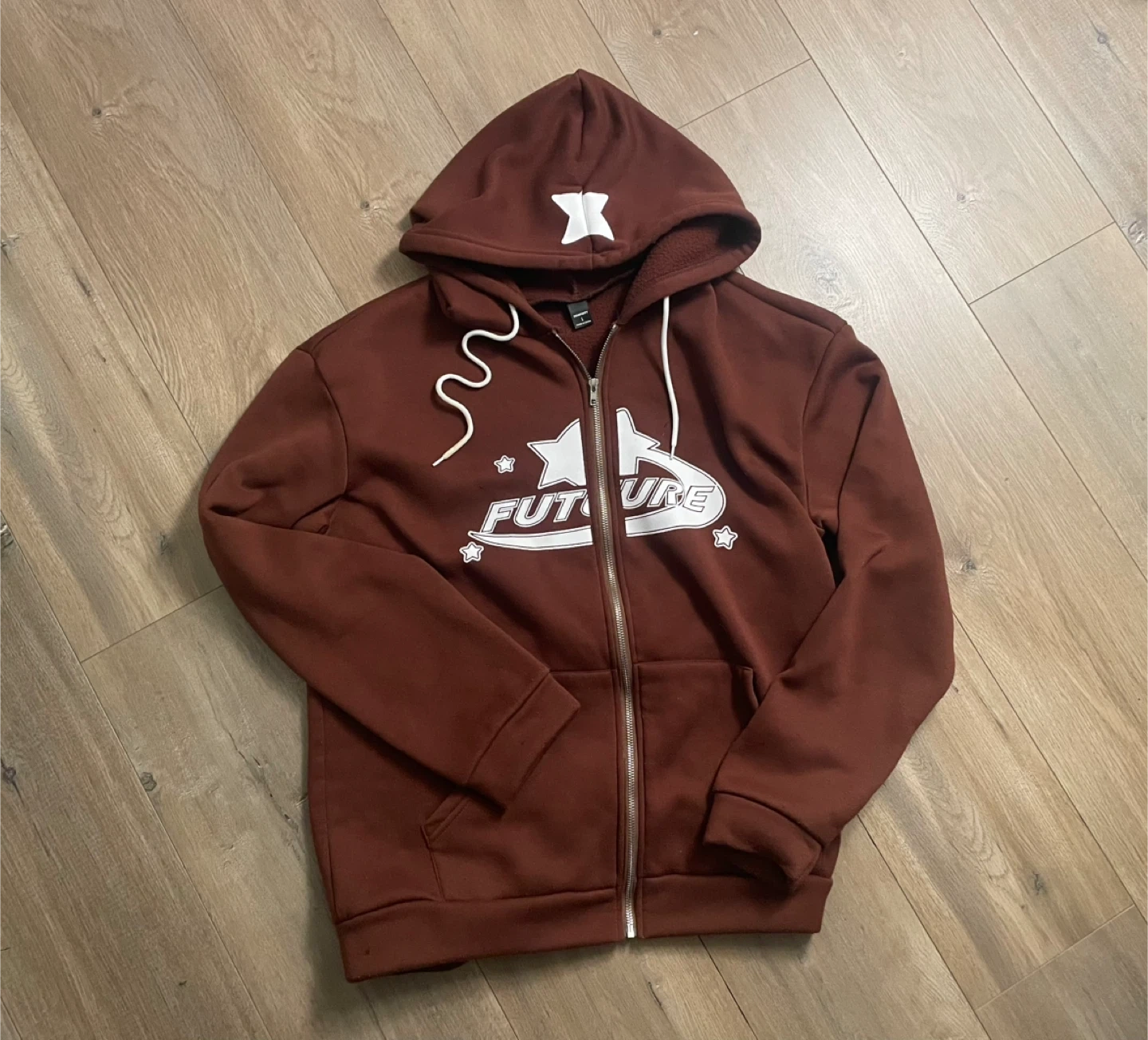 Cozy brown zip-up hoodie with a 'Future' graphic! It's got a cool, streetwear vibe. Perfect for layering or just chilling out on a cool day