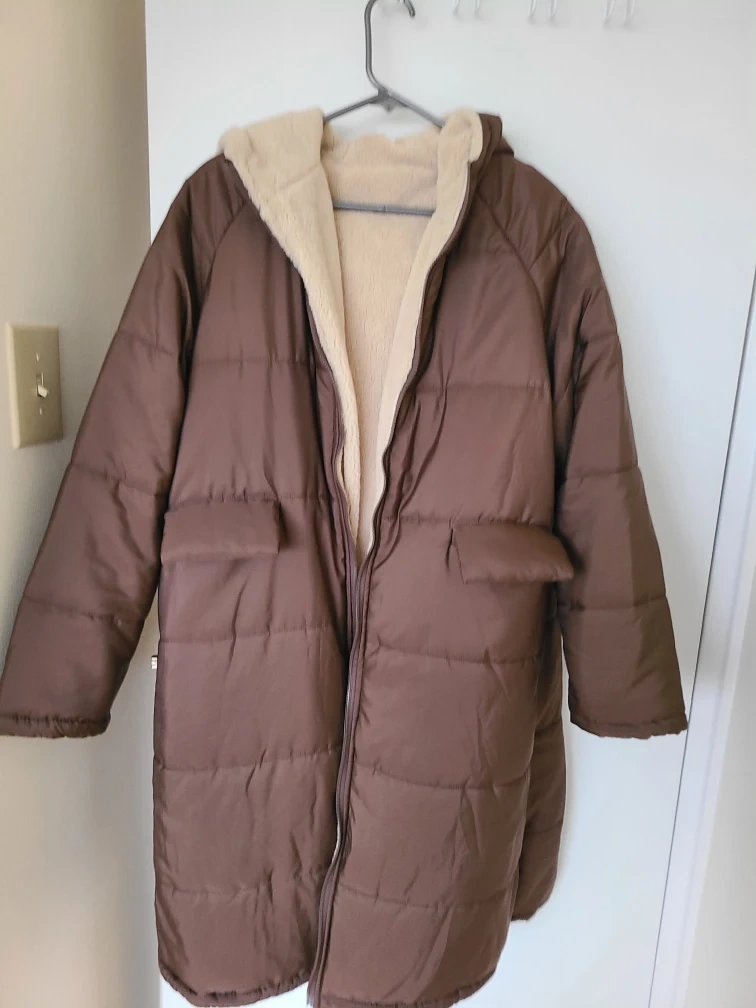 This cozy coat is reversible, giving you two stylish looks in one! One side is a soft sherpa, perfect for milder days, while the other is a quilted puffer for extra warmth. It's brown on one side and beige on the other, so it's versatile enough to match any outfit!