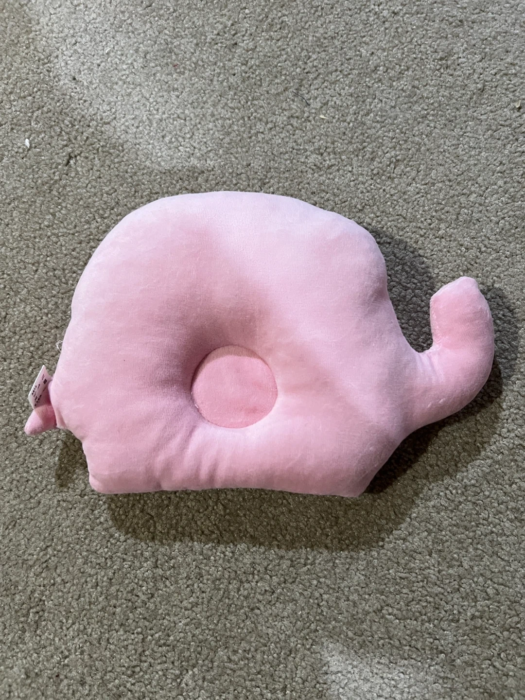 A cute baby pillow shaped like an elephant! It's a soft pink colour and has a little dip in the middle for baby's head. Perfect for keeping your little one comfy